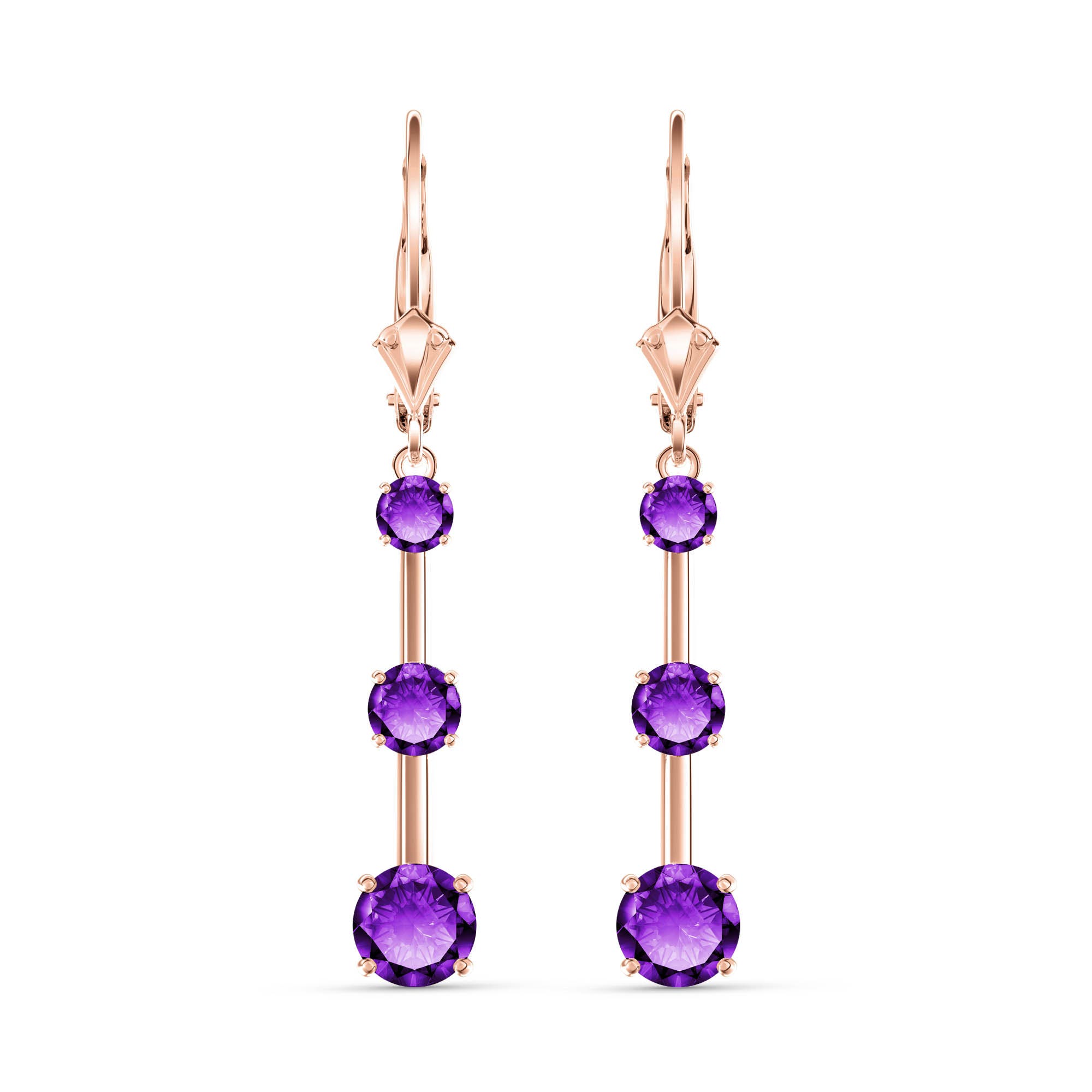 Amethyst Chandelierdrop Earrings handcrafted in rose gold plated 9ct gold. Six gemstones, total 2.5 ct for both earrings combined. Round cut. Size: 5.1 x 38.1 mm (0.2 x 1.5 in). Material: 9ct Rose Gold. Total metal weight: 2.4 gr. 2 round cut amethysts (3 x 3 mm) = 0.2 ct total for pair. 2 round cut amethysts (4 x 4 mm) = 1.1 ct total for pair. 2 round cut amethysts (5 x 5 mm) = 1.2 ct total for pair. Colour: Purple. Stone cut: Round Cut. Anniversary: 6th Anniversary. Birthstone: February.