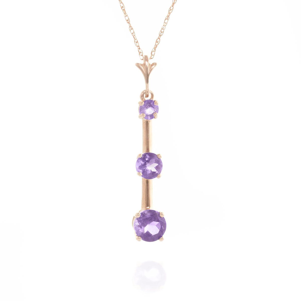 Amethyst Pendant Necklace handcrafted in rose gold plated 9ct gold. Three gemstones, total 1.25 ct. Round cut. The pendant is suspended from a rose gold double link rope chain with spring clasp. Size: 5.1 x 29.5 mm (0.2 x 1.16 in). Material: 9ct Rose Gold. Total metal weight: 1.94 gr. 1 round cut amethyst (3 x 3 mm) = 0.1 ct. 1 round cut amethyst (4 x 4 mm) = 0.55 ct. 1 round cut amethyst (5 x 5 mm) = 0.6 ct. Colour: Purple. Stone cut: Round Cut. Anniversary: 6th Anniversary. Birthstone: February.