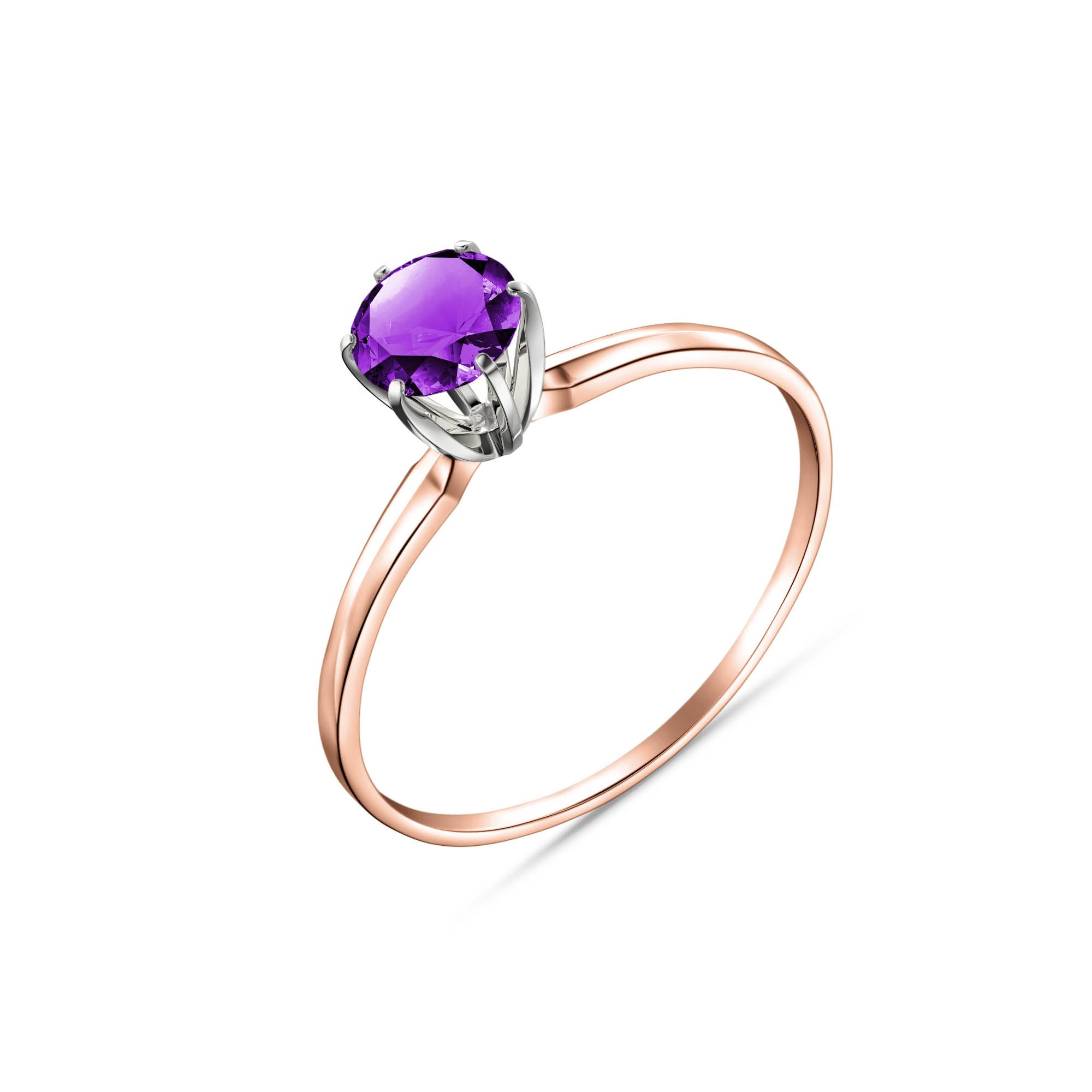 Amethyst Ring handcrafted in solid rose gold. Single 0.65 ct genuine amethyst. Round cut. Available from sizes H to Z including half sizes. Size: 5.8 mm (0.23 in). Material: 9ct Rose Gold. Total metal weight: 1.4 gr. 1 round cut amethyst (5 x 5 mm) = 0.65 ct. Colour: Purple. Stone cut: Round Cut. Anniversary: 6th Anniversary. Birthstone: February.