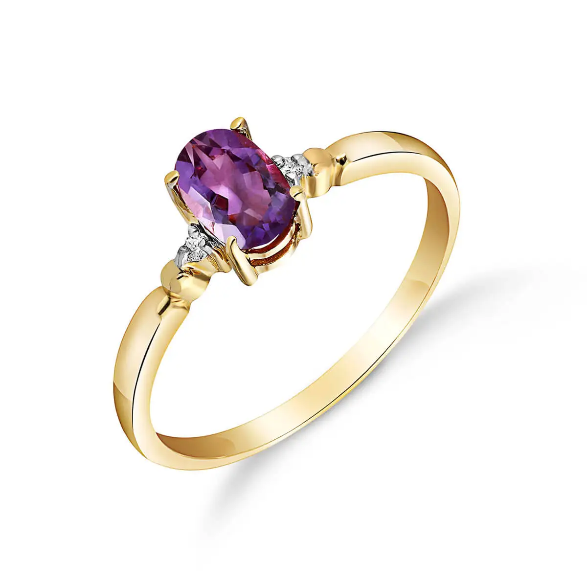 Amethyst & Diamond Ring handcrafted in solid 18ct gold. Single 0.45 ct genuine amethyst, two diamonds, total 0.01 ct. Oval cut. Available from sizes H to Z including half sizes. Size: 6.1 mm (0.24 in). Material: 18ct Gold. Total metal weight: 1.8 gr. 1 oval cut amethyst (6 x 4 mm) = 0.45 ct. 2 round cut diamonds (K colour, SI2 clarity) = 0.01 ct total. Colour: Purple. Stone cut: Oval Cut. Anniversary: 6th Anniversary. Birthstone: February.