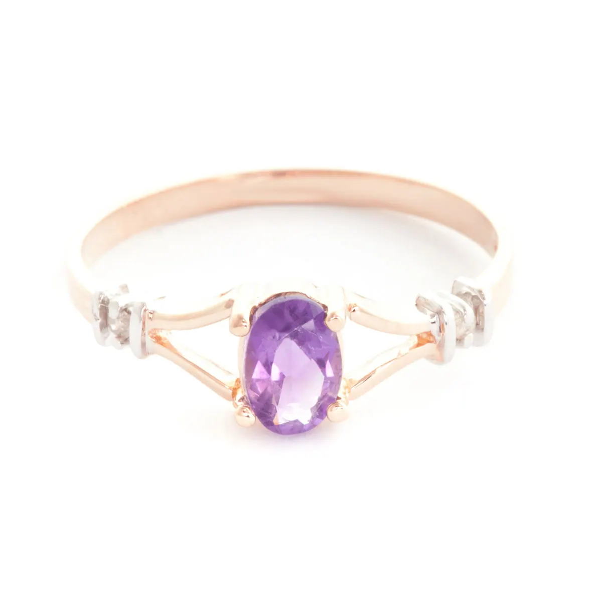 Amethyst & Diamond Ring handcrafted in solid rose gold. Single 0.45 ct genuine amethyst, two diamonds, total 0.01 ct. Oval cut. Available from sizes H to Z including half sizes. Size: 6.1 mm (0.24 in). Material: 9ct Rose Gold. Total metal weight: 1.6 gr. 1 oval cut amethyst (6 x 4 mm) = 0.45 ct. 2 round cut diamonds (K colour, SI2 clarity) = 0.01 ct total. Colour: Purple. Stone cut: Oval Cut. Anniversary: 6th Anniversary. Birthstone: February.