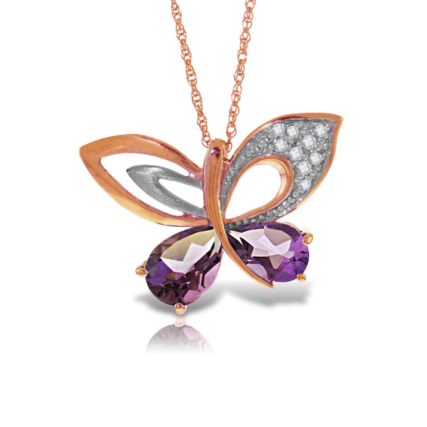 Amethyst & Diamond Butterfly Pendant Necklace handcrafted in rose gold plated 9ct gold. Two gemstones, total 3.5 ct, nine diamonds, total 0.18 ct. Pear cut. The pendant is suspended from a rose gold double link rope chain with spring clasp. Size: 27.9 x 19.8 mm (1.1 x 0.78 in). Material: 9ct Rose Gold. Total metal weight: 4.24 gr. 1 pear cut amethyst (10 x 7 mm) = 2 ct. 1 pear cut amethyst (9 x 6 mm) = 1.5 ct. 9 round cut diamonds (K colour, I3 clarity) = 0.18 ct total. Colour: Purple. Stone cut: Pear Cut. Anniversary: 6th Anniversary. Birthstone: February.