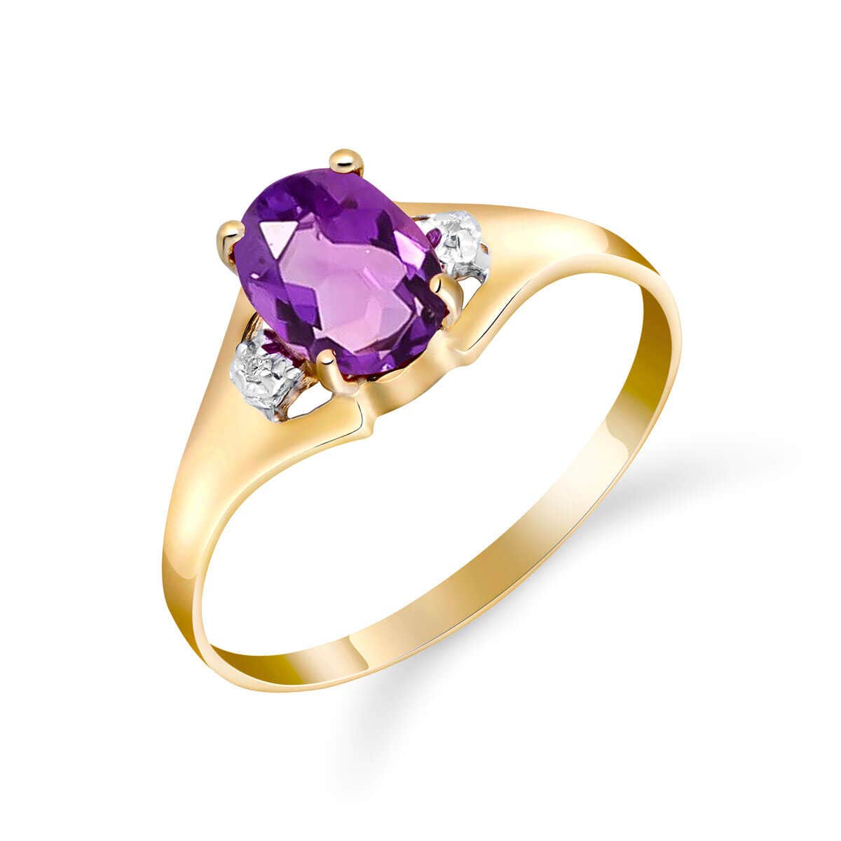 Amethyst & Diamond Ring handcrafted in solid 18ct gold. Single 0.75 ct genuine amethyst, two diamonds, total 0.01 ct. Oval cut. Available from sizes H to Z including half sizes. Size: 6.6 mm (0.26 in). Material: 18ct Gold. Total metal weight: 1.5 gr. 1 oval cut amethyst (7 x 5 mm) = 0.75 ct. 2 round cut diamonds (K colour, I3 clarity) = 0.01 ct total. Colour: Purple. Stone cut: Oval Cut. Anniversary: 6th Anniversary. Birthstone: February.
