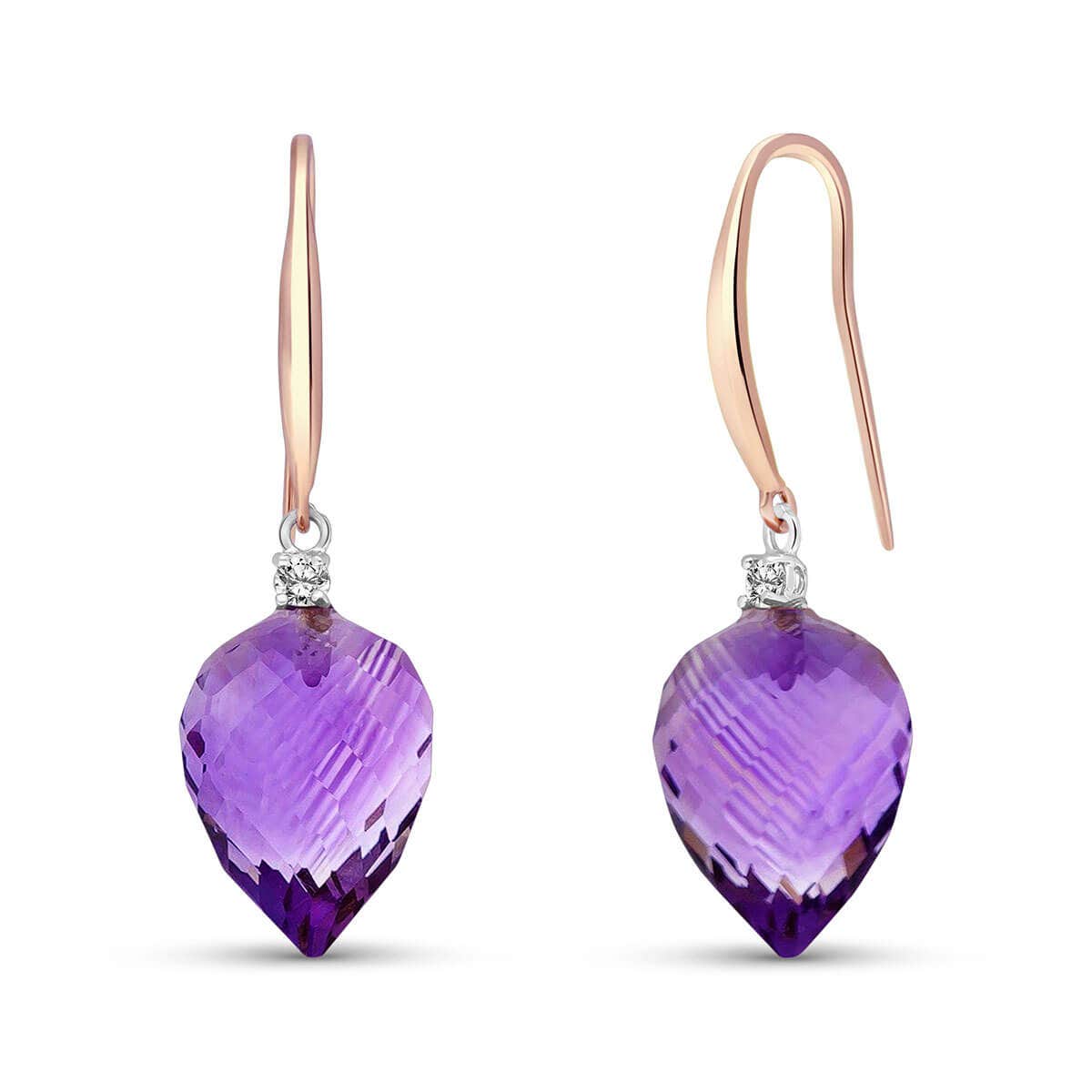 Amethyst & Diamond Fish Hook Earrings handcrafted in rose gold plated 9ct gold. Two genuine amethysts, total 19 ct, two diamonds, total 0.1 ct for both earrings combined. Pointed briolette cut. Size: 10.2 x 34.8 mm (0.4 x 1.37 in). Material: 9ct Rose Gold. Total metal weight: 4.0 gr. 2 pointed briolette cut amethysts (15 x 10 mm) = 19 ct total for pair. 2 round cut diamonds (K colour, I3 clarity) = 0.1 ct total for pair. Colour: Purple. Stone cut: Pointed Briolette Cut. Anniversary: 6th Anniversary. Birthstone: February.