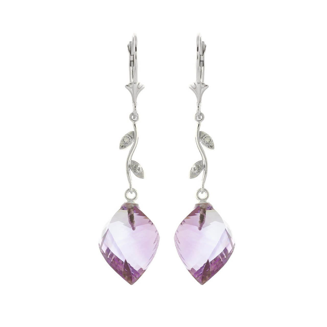 Amethyst & Diamond Chandelier Earrings handcrafted in solid white gold. Two genuine amethysts, total 21.5 ct, four diamonds, total 0.02 ct for both earrings combined. Twisted briolette cut. Size: 12.7 x 47.8 mm (0.5 x 1.88 in). Material: 9ct White Gold. Total metal weight: 5.0 gr. 2 twisted briolette cut amethysts (15 x 13 mm) = 21.5 ct total for pair. 4 round cut diamonds (K colour, I3 clarity) = 0.02 ct total for pair. Colour: Purple. Stone cut: Twisted Briolette Cut. Anniversary: 6th Anniversary. Birthstone: February.