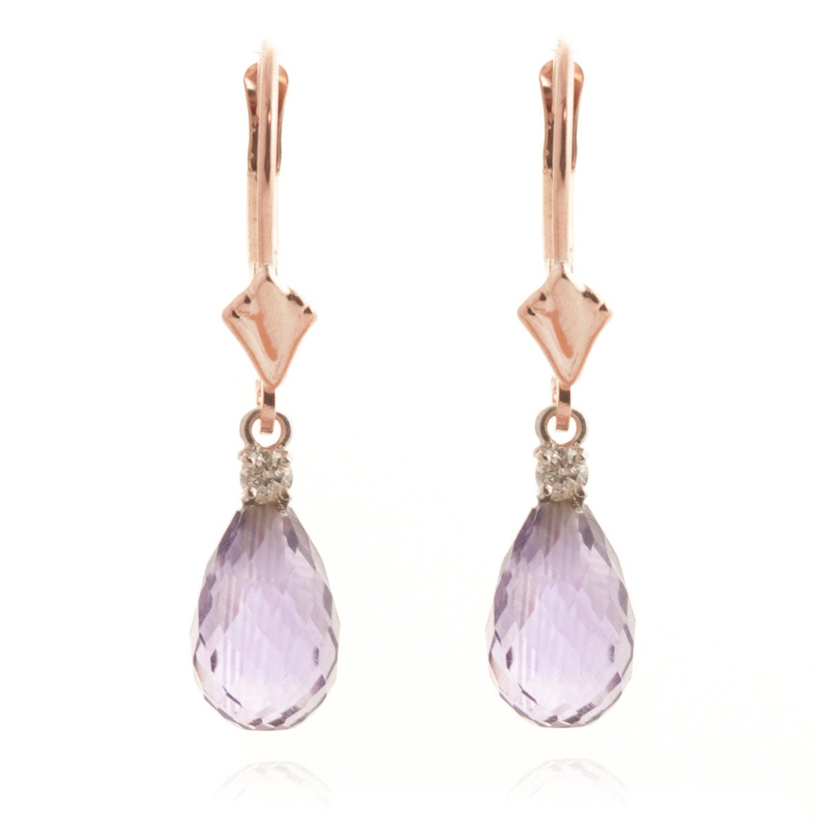 Amethyst & Diamond Leverback Earrings handcrafted in rose gold plated 9ct gold. Two genuine amethysts, total 4.5 ct, two diamonds, total 0.1 ct for both earrings combined. Briolette cut. Size: 6.1 x 28.2 mm (0.24 x 1.11 in). Material: 9ct Rose Gold. Total metal weight: 1.9 gr. 2 briolette cut amethysts (9 x 6 mm) = 4.5 ct total for pair. 2 round cut diamonds (I colour, SI2 clarity) = 0.1 ct total for pair. Colour: Purple. Stone cut: Briolette Cut. Anniversary: 6th Anniversary. Birthstone: February.