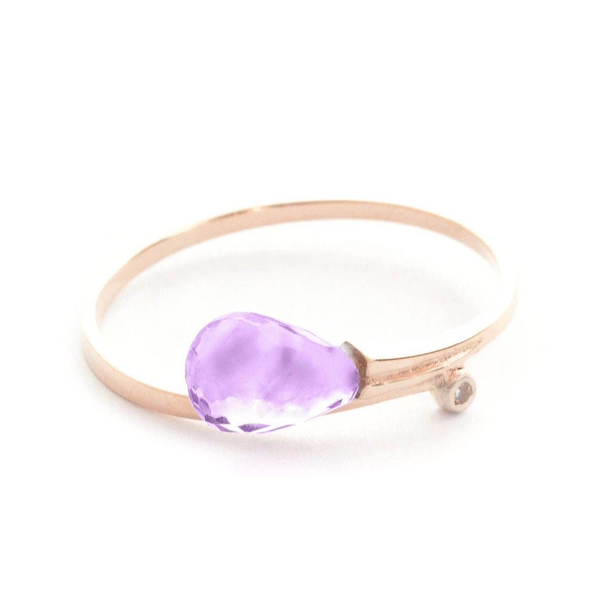 Amethyst & Diamond Ring handcrafted in solid 18ct rose gold. Single 1.5 ct genuine amethyst, single 0.01 ct diamond. Briolette cut. Available from sizes H to Z including half sizes. Size: 6.4 mm (0.25 in). Material: 18ct Rose Gold. Total metal weight: 1.3 gr. 1 briolette cut amethyst (7 x 5 mm) = 1.5 ct. 1 round brilliant cut diamond (K colour, SI1 clarity) = 0.01 ct. Colour: Purple. Stone cut: Briolette Cut. Anniversary: 6th Anniversary. Birthstone: February.