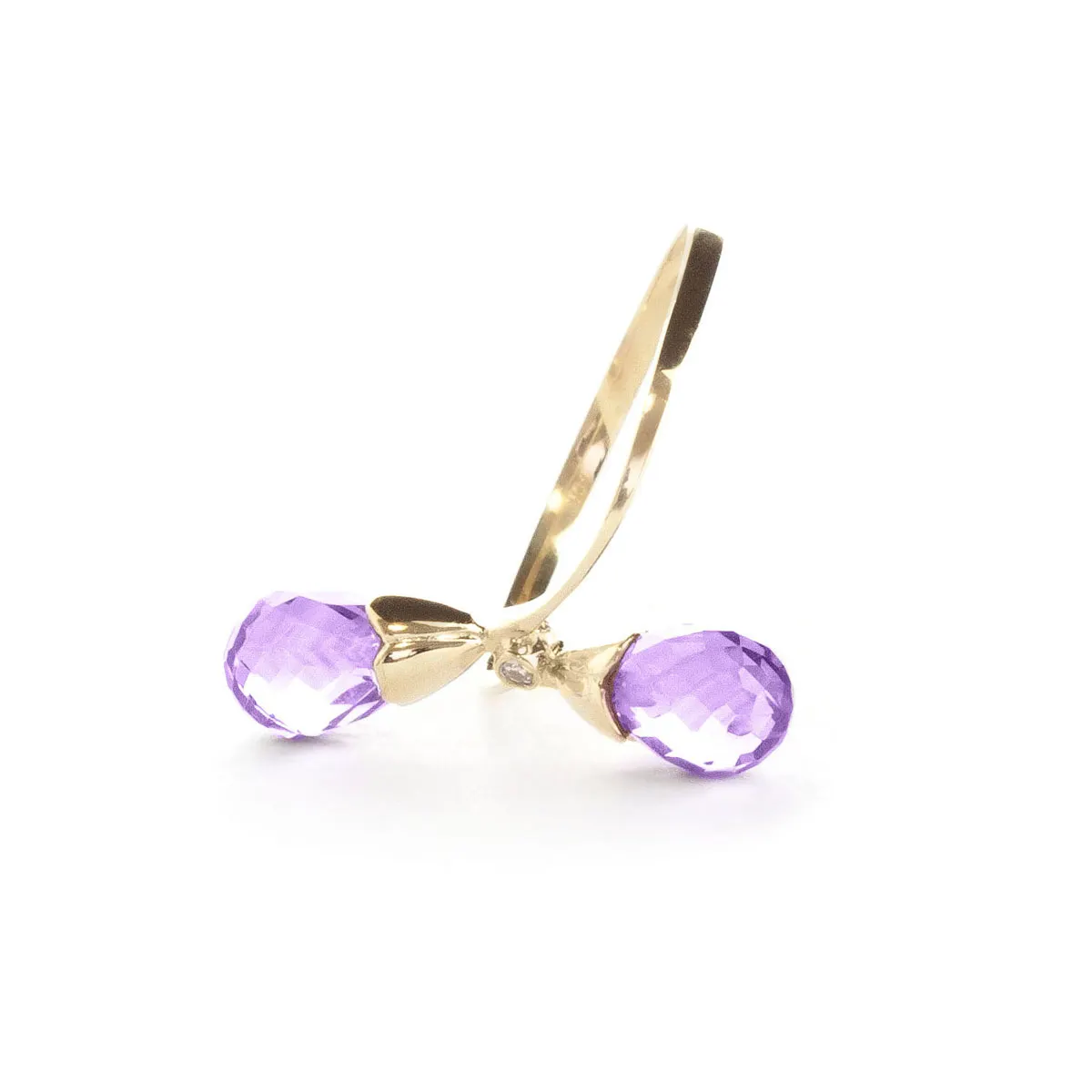 Amethyst & Diamond Ring handcrafted in solid 18ct gold. Two genuine amethysts, total 2.5 ct, single 0.02 ct diamond. Briolette cut. Available from sizes H to Z including half sizes. Size: 18.5 mm (0.73 in). Material: 18ct Gold. Total metal weight: 2.0 gr. 2 briolette cut amethysts (7 x 5 mm) = 2.5 ct total. 1 round brilliant cut diamond (K colour, SI2 clarity) = 0.02 ct. Colour: Purple. Stone cut: Briolette Cut. Anniversary: 6th Anniversary. Birthstone: February.