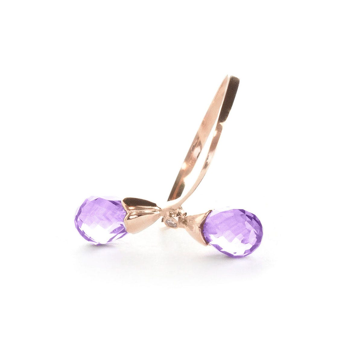 Amethyst & Diamond Ring handcrafted in solid 18ct rose gold. Two genuine amethysts, total 2.5 ct, single 0.02 ct diamond. Briolette cut. Available from sizes H to Z including half sizes. Size: 18.5 mm (0.73 in). Material: 18ct Rose Gold. Total metal weight: 2.0 gr. 2 briolette cut amethysts (7 x 5 mm) = 2.5 ct total. 1 round brilliant cut diamond (K colour, SI2 clarity) = 0.02 ct. Colour: Purple. Stone cut: Briolette Cut. Anniversary: 6th Anniversary. Birthstone: February.