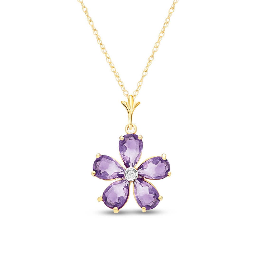Amethyst & Diamond Pendant Necklace handcrafted in solid gold. Five genuine amethysts, total 2.2 ct, single 0.02 ct diamond. Pear cut. The pendant is suspended from a gold double link rope chain with spring clasp. Size: 14.2 x 22.4 mm (0.56 x 0.88 in). Material: 9ct Gold. Total metal weight: 2.24 gr. 5 pear cut amethysts (6 x 4 mm) = 2.2 ct total. 1 round brilliant cut diamond (K colour, SI1 clarity) = 0.02 ct. Colour: Purple. Stone cut: Pear Cut. Anniversary: 6th Anniversary. Birthstone: February.