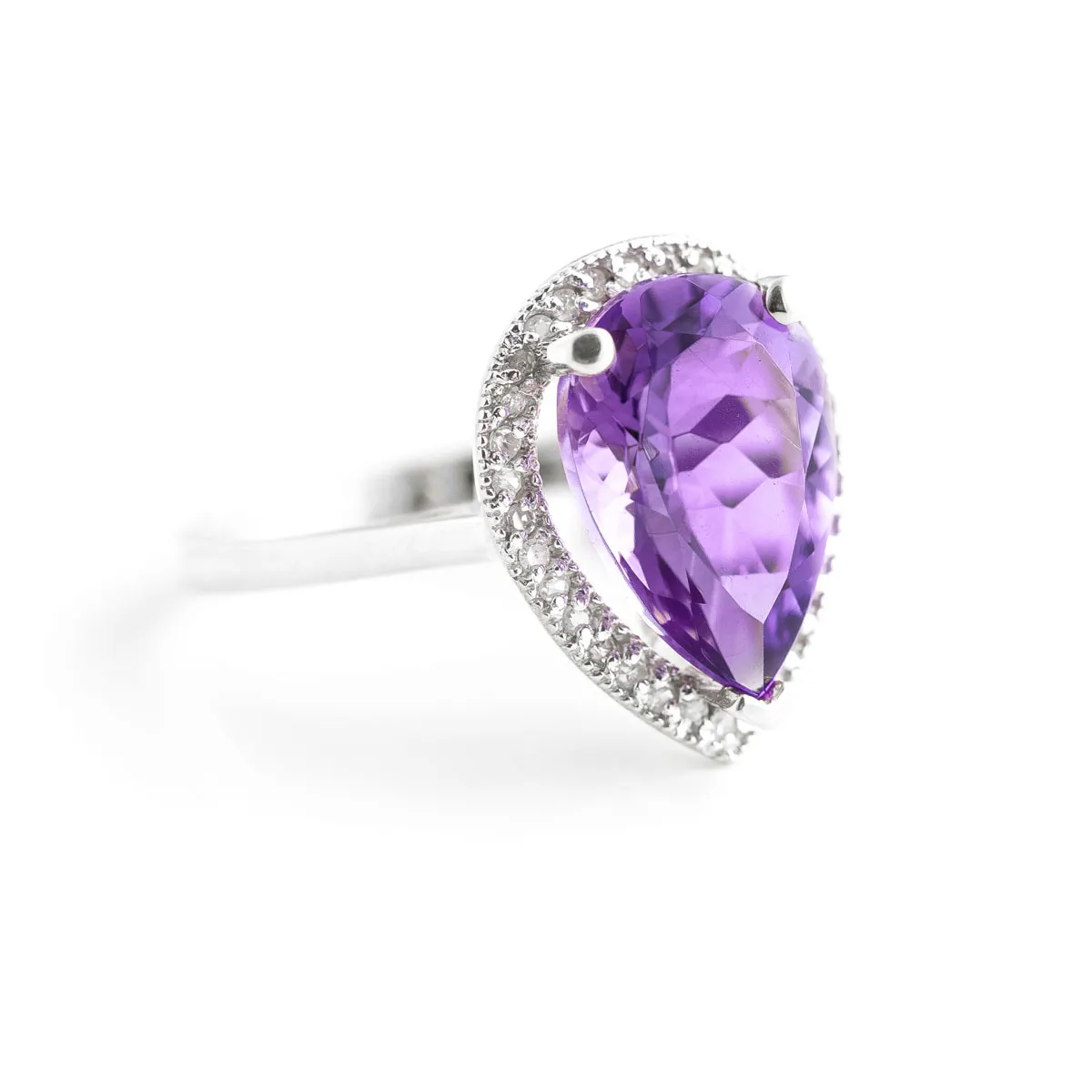 Amethyst & Diamond Ring handcrafted in solid 18ct white gold. Single 3.25 ct genuine amethyst, 32 diamonds, total 0.16 ct. Pear cut. Available from sizes H to Z including half sizes. Size: 16.3 mm (0.64 in). Material: 18ct White Gold. Total metal weight: 4.2 gr. 1 pear cut amethyst (13 x 9 mm) = 3.25 ct. 32 round cut diamonds (K colour, I3 clarity) = 0.16 ct total. Colour: Purple. Stone cut: Pear Cut. Anniversary: 6th Anniversary. Birthstone: February.
