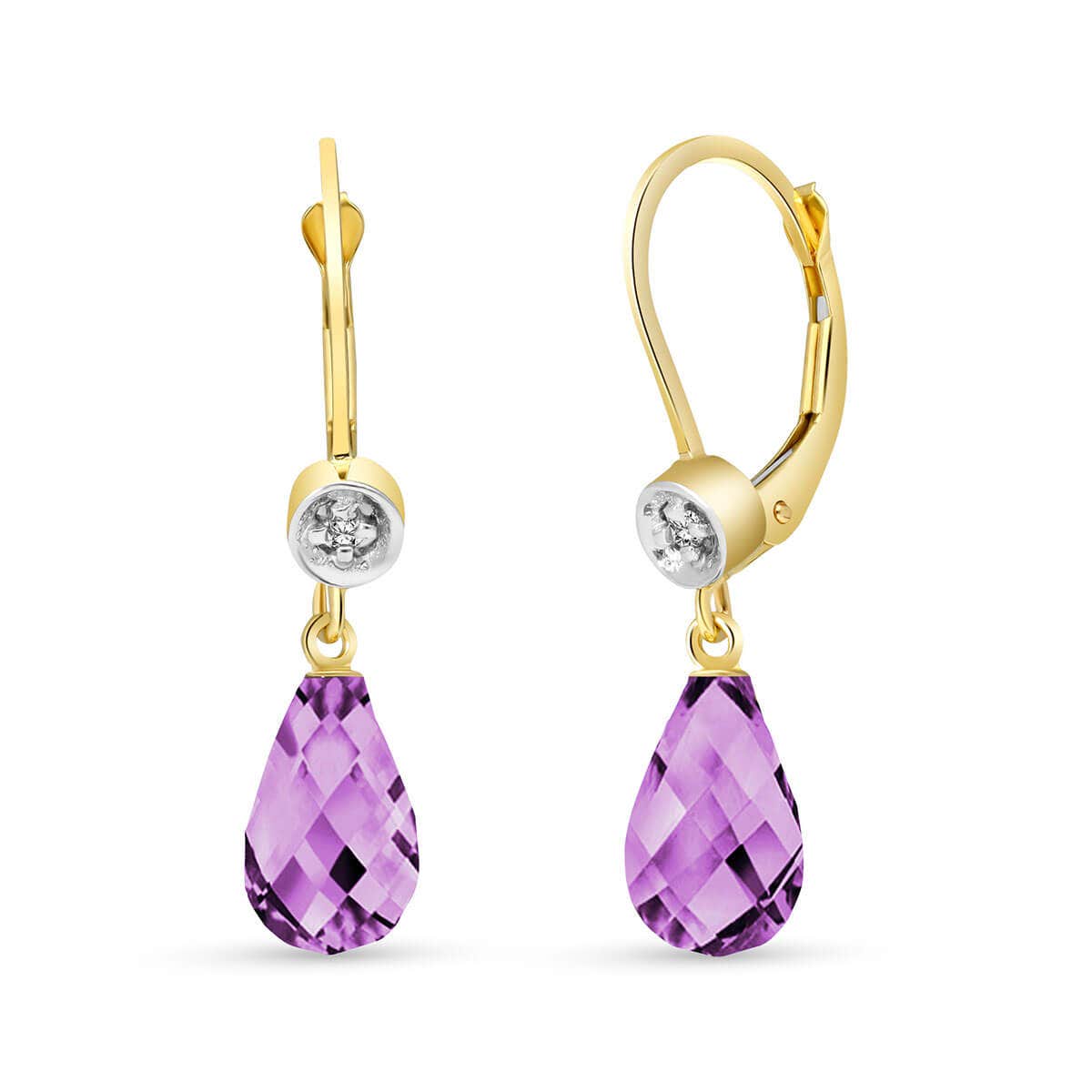 Amethyst & Diamond Leverback Earrings handcrafted in solid gold. Two genuine amethysts, total 4.5 ct, two diamonds, total 0.03 ct for both earrings combined. Briolette cut. Size: 4.1 x 27.7 mm (0.16 x 1.09 in). Material: 9ct Gold. Total metal weight: 1.7 gr. 2 briolette cut amethysts (9 x 6 mm) = 4.5 ct total for pair. 2 round cut diamonds (K colour, SI2 clarity) = 0.03 ct total for pair. Colour: Purple. Stone cut: Briolette Cut. Anniversary: 6th Anniversary. Birthstone: February.