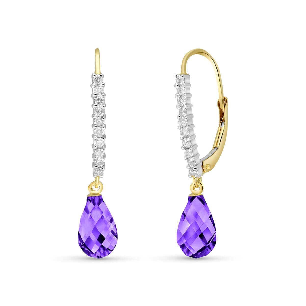 Amethyst & Diamond Leverback Earrings handcrafted in solid gold. Two genuine amethysts, total 4.5 ct, 20 diamonds, total 0.3 ct for both earrings combined. Briolette cut. Size: 2.3 x 31 mm (0.09 x 1.22 in). Material: 9ct Gold. Total metal weight: 2.0 gr. 2 briolette cut amethysts (9 x 6 mm) = 4.5 ct total for pair. 20 round cut diamonds (I colour, SI1 clarity) = 0.3 ct total for pair. Colour: Purple. Stone cut: Briolette Cut. Anniversary: 6th Anniversary. Birthstone: February.