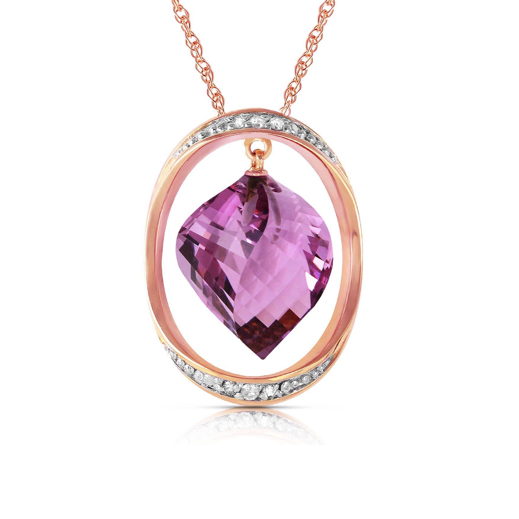 Amethyst & Diamond Pendant Necklace handcrafted in rose gold plated 9ct gold. Single 10.75 ct genuine amethyst, six diamonds, total 0.1 ct. Twisted briolette cut. The pendant hangs from a rose gold double link rope chain with spring clasp. Size: 19.1 x 25.4 mm (0.75 x 1 in). Material: 9ct Rose Gold. Total metal weight: 5.64 gr. 1 twisted briolette cut amethyst (15 x 13 mm) = 10.75 ct. 6 round cut diamonds (G colour, SI1 clarity) = 0.1 ct total. Colour: Purple. Stone cut: Twisted Briolette Cut. Anniversary: 6th Anniversary. Birthstone: February.