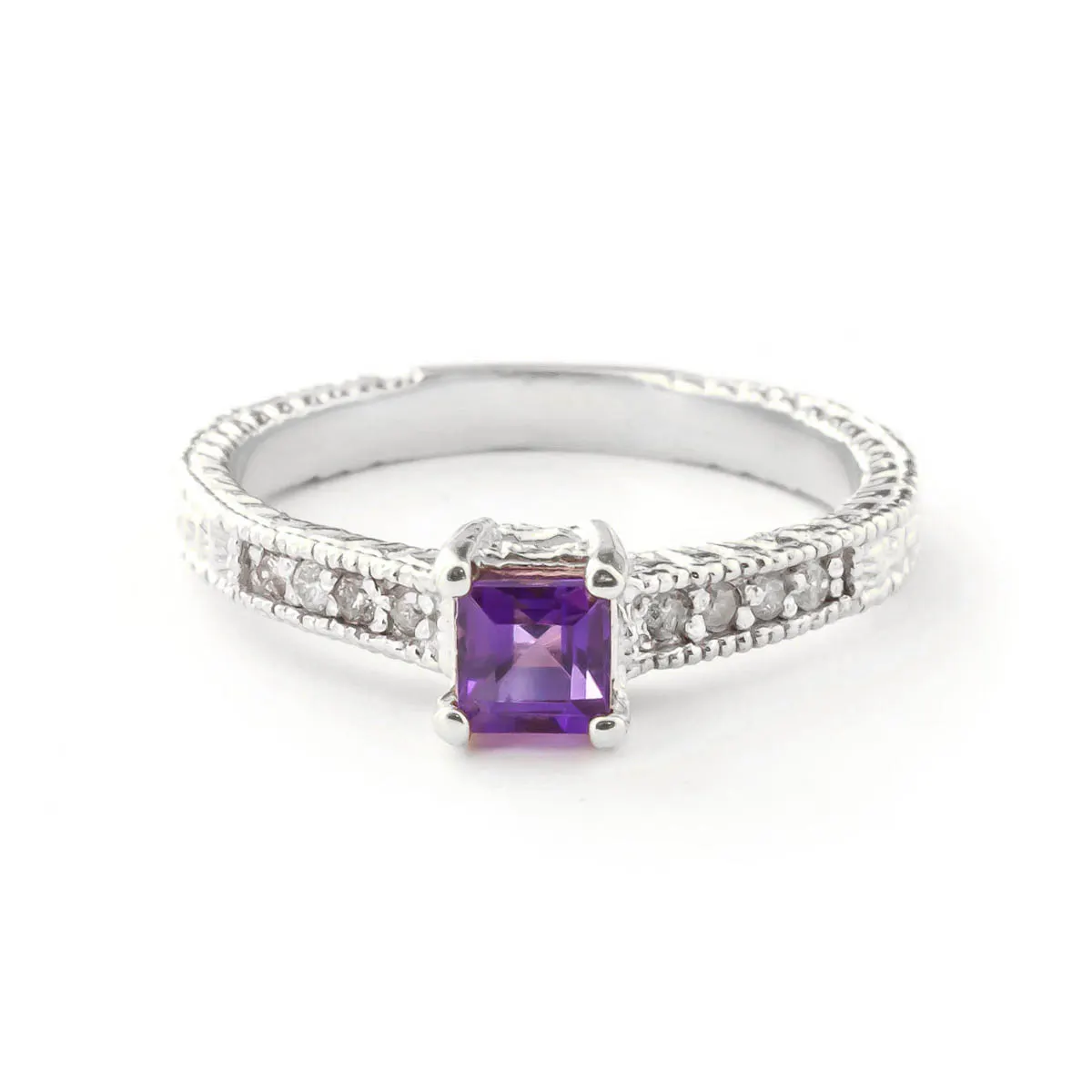 Amethyst & Diamond Ring handcrafted in solid white gold. Single 0.5 ct genuine amethyst, eight diamonds, total 0.15 ct. Princess cut. Available from sizes H to Z including half sizes. Size: 2.5 mm (0.1 in). Material: 9ct White Gold. Total metal weight: 2.6 gr. 1 princess cut amethyst (4 x 4 mm) = 0.5 ct. 8 round cut diamonds (K colour, SI2 clarity) = 0.15 ct total. Colour: Purple. Stone cut: Princess Cut. Anniversary: 6th Anniversary. Birthstone: February.