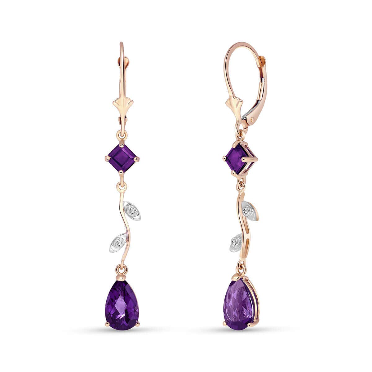 Amethyst & Diamond Chandelierdrop Earrings handcrafted in rose gold plated 9ct gold. Four gemstones, total 3.95 ct, four diamonds, total 0.02 ct for both earrings combined. Square cut. Size: 6.1 x 48.3 mm (0.24 x 1.9 in). Material: 9ct Rose Gold. Total metal weight: 2.6 gr. 2 square cut amethysts (4 x 4 mm) = 0.95 ct total for pair. 2 pear cut amethysts (9 x 6 mm) = 3 ct total for pair. 4 round cut diamonds (K colour, SI1 clarity) = 0.02 ct total for pair. Colour: Purple. Stone cut: Square Cut. Anniversary: 6th Anniversary. Birthstone: February.