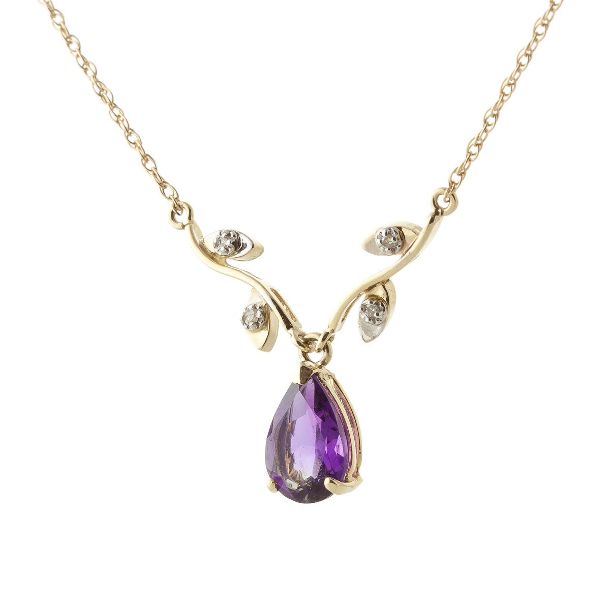 Amethyst & Diamond Pendant Necklace handcrafted in solid gold. Single 1.5 ct genuine amethyst, four diamonds, total 0.02 ct. Pear cut. The pendant is suspended from a gold double link rope chain with spring clasp. Size: 22.1 mm (0.87 in). Material: 9ct Gold. Total metal weight: 2.04 gr. 1 pear cut amethyst (9 x 6 mm) = 1.5 ct. 4 round cut diamonds (K colour, SI1 clarity) = 0.02 ct total. Colour: Purple. Stone cut: Pear Cut. Anniversary: 6th Anniversary. Birthstone: February.