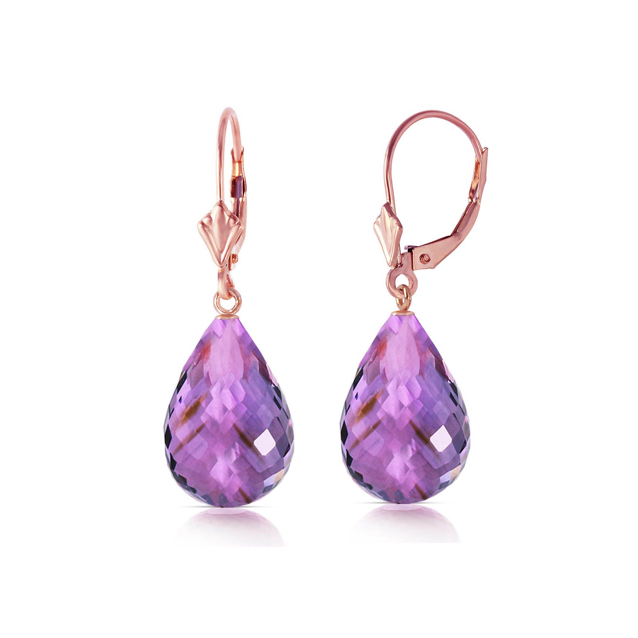 Amethyst Leverback Earrings handcrafted in rose gold plated 9ct gold. Two genuine amethysts, total 14 ct for both earrings combined. Briolette cut. Size: 9.1 x 31.2 mm (0.36 x 1.23 in). Material: 9ct Rose Gold. Total metal weight: 3.4 gr. 2 briolette cut amethysts (14 x 9 mm) = 14 ct total for pair. Colour: Purple. Stone cut: Briolette Cut. Anniversary: 6th Anniversary. Birthstone: February.