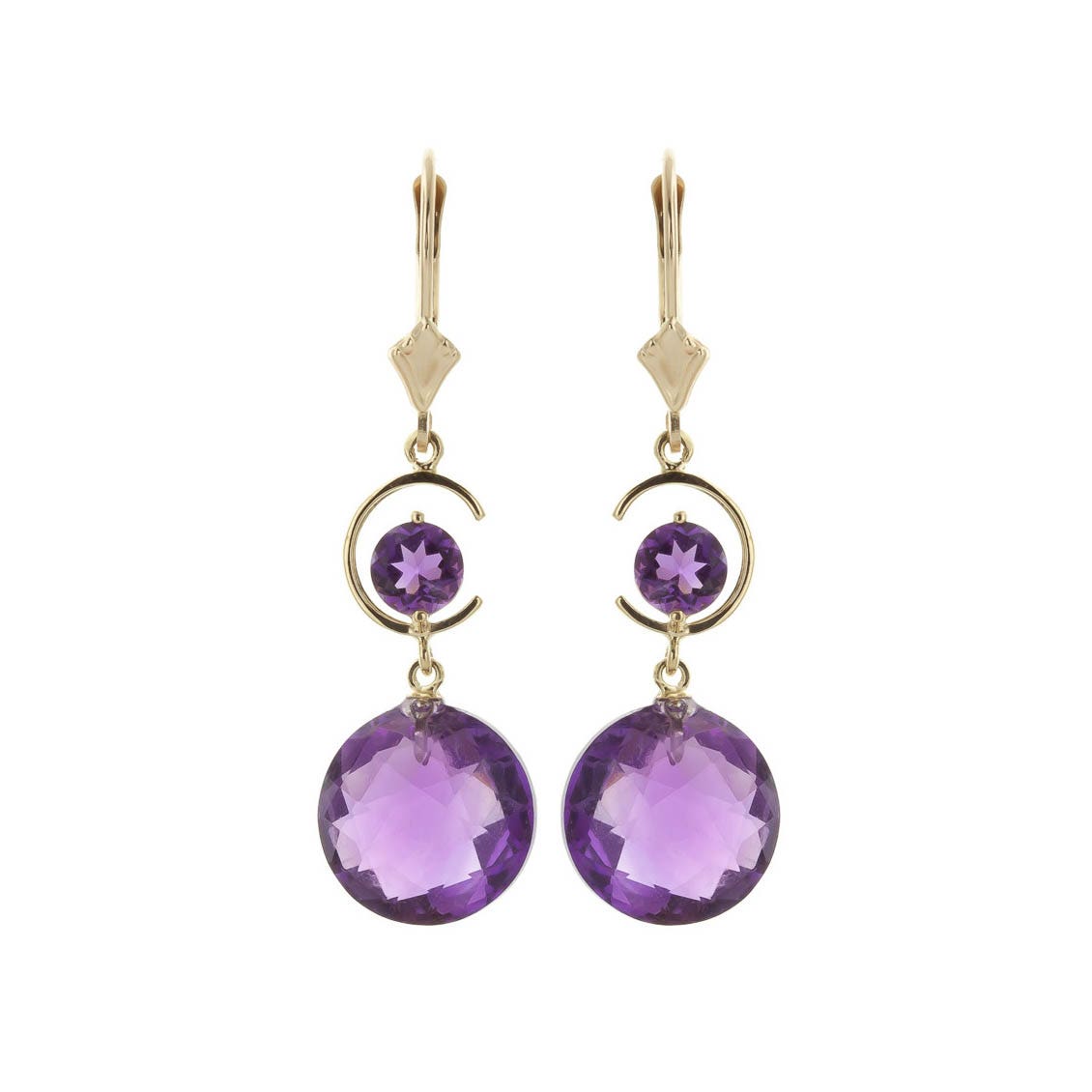 Amethyst Leverback Earrings handcrafted in solid gold. Four gemstones, total 11.6 ct for both earrings combined. Round cut. Size: 7.9 x 41.1 mm (0.31 x 1.62 in). Material: 9ct Gold. Total metal weight: 3.4 gr. 2 round cut amethysts (12 x 12 mm) = 10.6 ct total for pair. 2 round cut amethysts (5 x 5 mm) = 1 ct total for pair. Colour: Purple. Stone cut: Round Cut. Anniversary: 6th Anniversary. Birthstone: February.