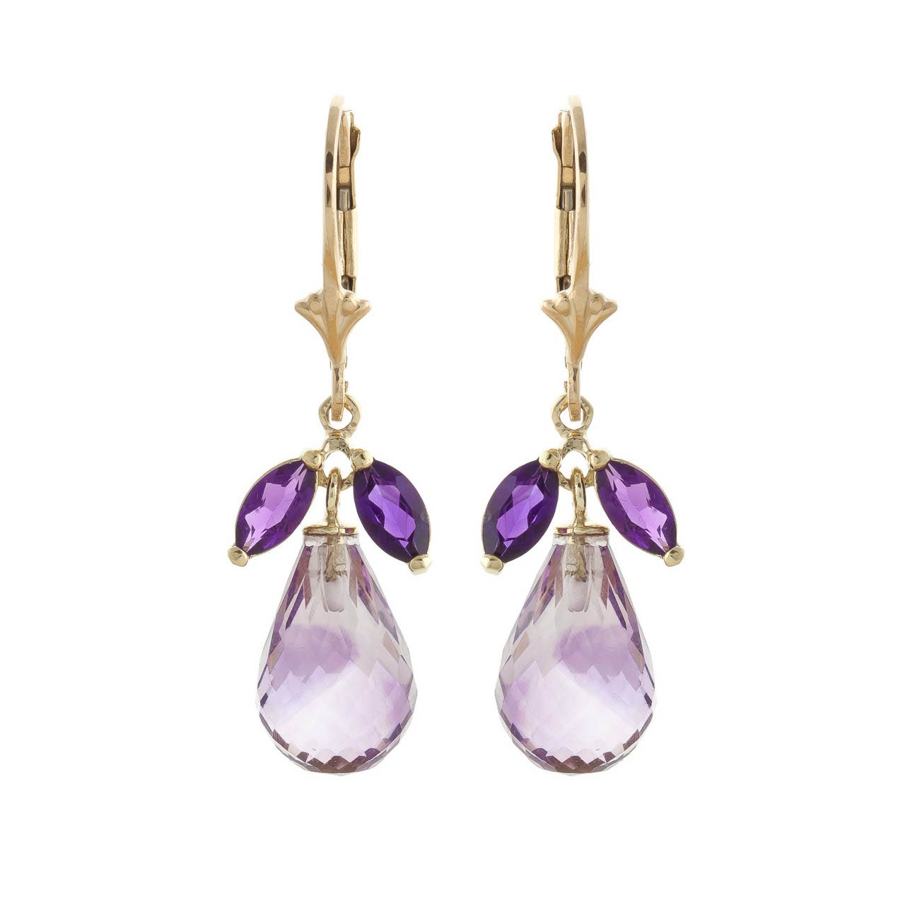 Amethyst Leverback Earrings handcrafted in solid gold. Six gemstones, total 14.4 ct for both earrings combined. Marquise cut. Size: 10.2 x 33 mm (0.4 x 1.3 in). Material: 9ct Gold. Total metal weight: 3.9 gr. 4 marquise cut amethysts (6 x 3 mm) = 1 ct total for pair. 2 briolette cut amethysts (12 x 8 mm) = 13.4 ct total for pair. Colour: Purple. Stone cut: Marquise Cut. Anniversary: 6th Anniversary. Birthstone: February.