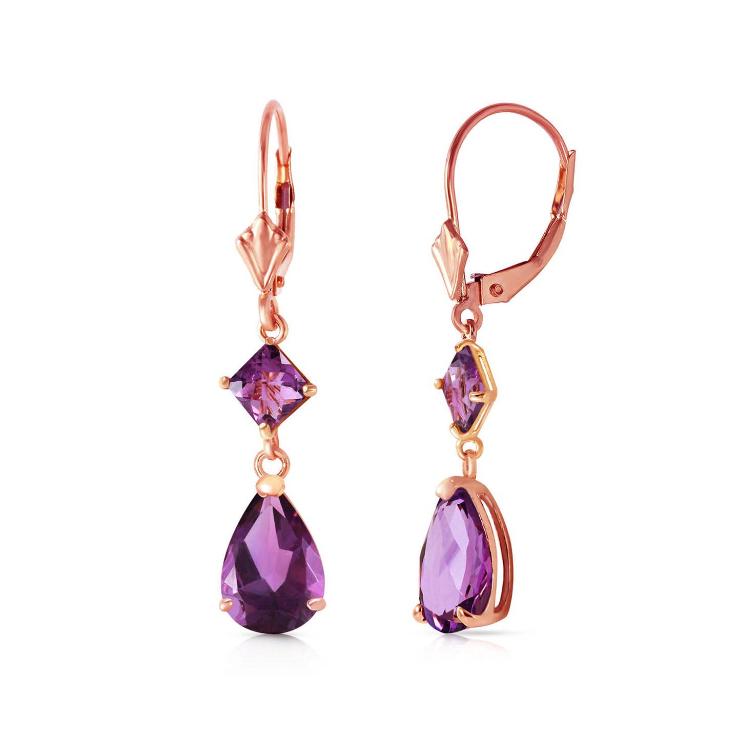Amethyst Leverback Earrings handcrafted in rose gold plated 9ct gold. Four gemstones, total 4.5 ct for both earrings combined. Pear cut. Size: 6.1 x 34.5 mm (0.24 x 1.36 in). Material: 9ct Rose Gold. Total metal weight: 2.1 gr. 2 pear cut amethysts (9 x 6 mm) = 3.5 ct total for pair. 2 square cut amethysts (4 x 4 mm) = 1 ct total for pair. Colour: Purple. Stone cut: Pear Cut. Anniversary: 6th Anniversary. Birthstone: February.