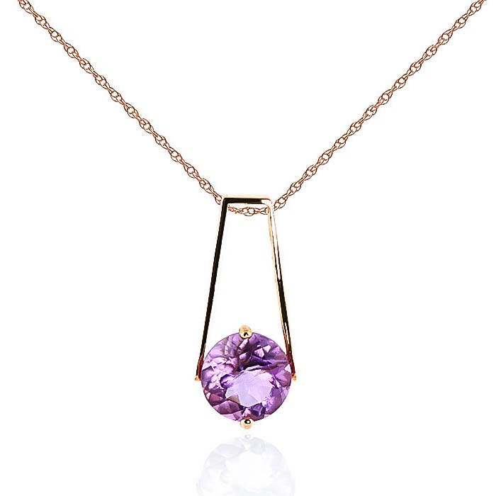 Amethyst Pendant Necklace handcrafted in rose gold plated 9ct gold. Single 1.45 ct genuine amethyst. Round cut. The pendant is suspended from a rose gold double link rope chain with spring clasp. Size: 7.1 x 18 mm (0.28 x 0.71 in). Material: 9ct Rose Gold. Total metal weight: 1.54 gr. 1 round cut amethyst (7 x 7 mm) = 1.45 ct. Colour: Purple. Stone cut: Round Cut. Anniversary: 6th Anniversary. Birthstone: February.