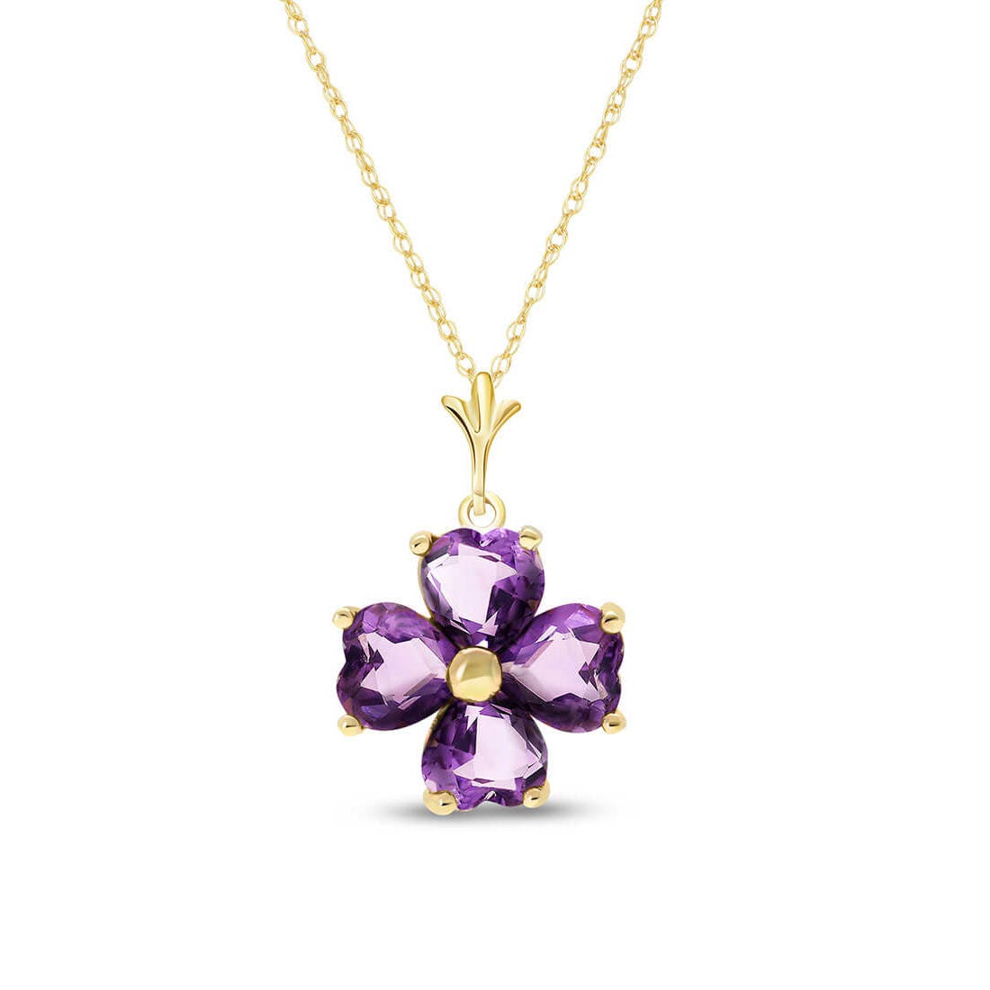Amethyst Pendant Necklace handcrafted in solid gold. Four genuine amethysts, total 3.8 ct. Heart shaped. The pendant is suspended from a gold double link rope chain with spring clasp. Size: 13.7 x 20.8 mm (0.54 x 0.82 in). Material: 9ct Gold. Total metal weight: 2.84 gr. 4 heart shaped amethysts (6 x 6 mm) = 3.8 ct total. Colour: Purple. Stone cut: Heart Shaped. Anniversary: 6th Anniversary. Birthstone: February.