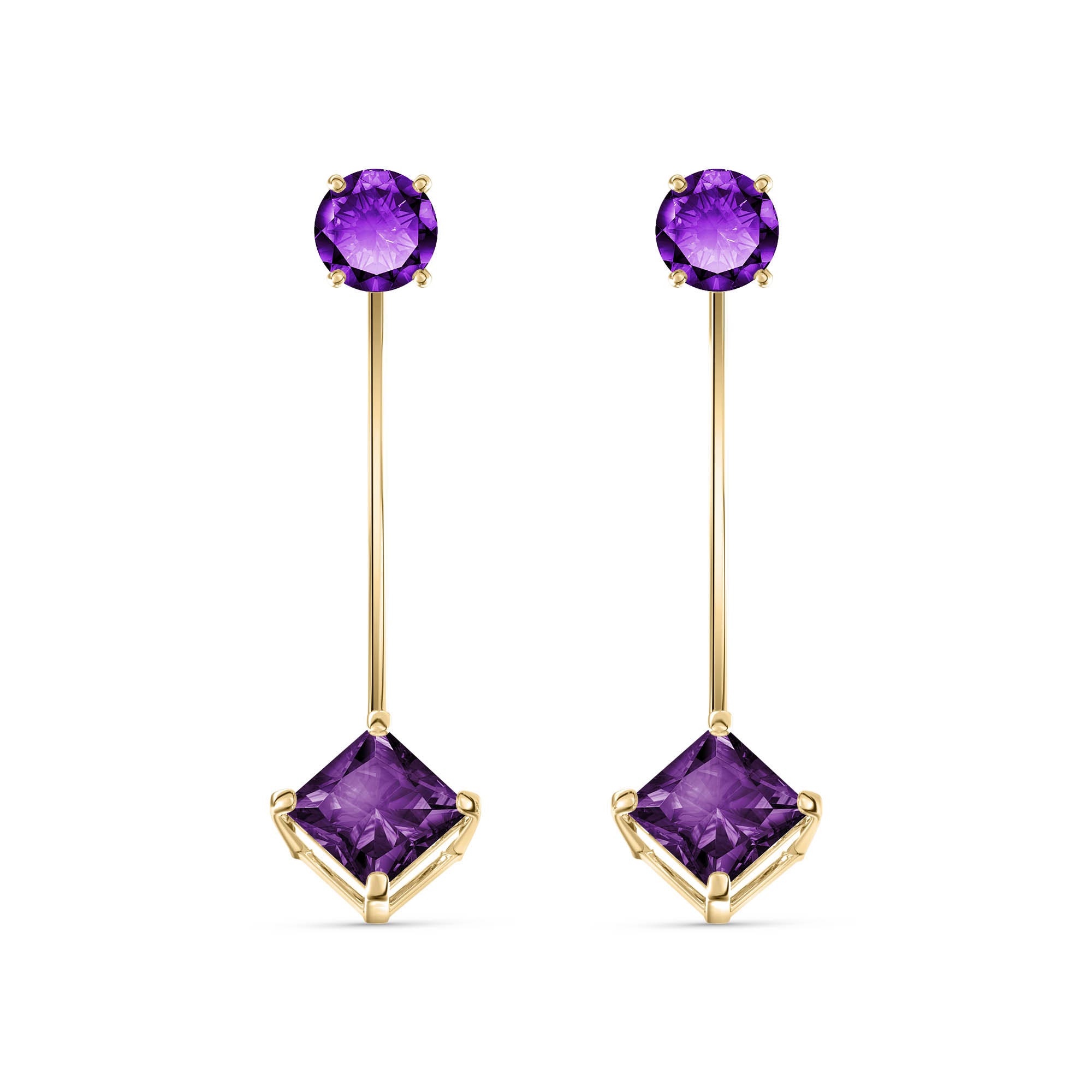 Amethyst Chandelier Drop Earrings handcrafted in solid gold. Four gemstones, total 4.15 ct for both earrings combined. Round cut. Size: 9.4 x 35.8 mm (0.37 x 1.41 in). Material: 9ct Gold. Total metal weight: 2.4 gr. 2 round cut amethysts (5 x 5 mm) = 0.95 ct total for pair. 2 square cut amethysts (7 x 7 mm) = 3.2 ct total for pair. Colour: Purple. Stone cut: Round Cut. Anniversary: 6th Anniversary. Birthstone: February.