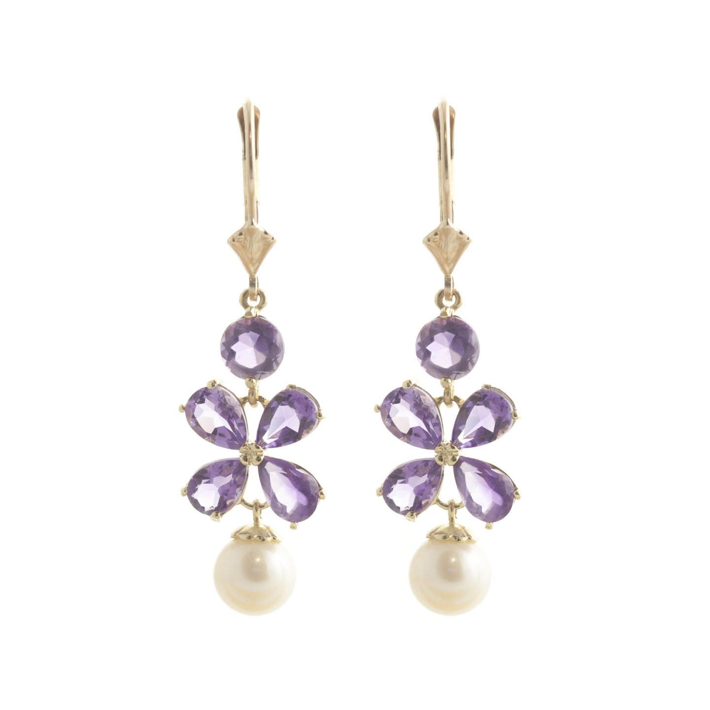 Amethyst & Pearl Chandelier Earrings handcrafted in solid gold. Twelve gemstones, total 6.28 ct for both earrings combined. Pear cut. Size: 11.9 x 40.9 mm (0.47 x 1.61 in). Material: 9ct Gold. Total metal weight: 3.4 gr. 8 pear cut amethysts (6 x 4 mm) = 3.25 ct total for pair. 2 round cut amethysts (5 x 5 mm) = 1.03 ct total for pair. 2 freshwater pearls (7 x 7 mm) = 2 ct total for pair. Colour: Purple. Stone cut: Pear Cut. Anniversary: 6th Anniversary. Birthstone: February.