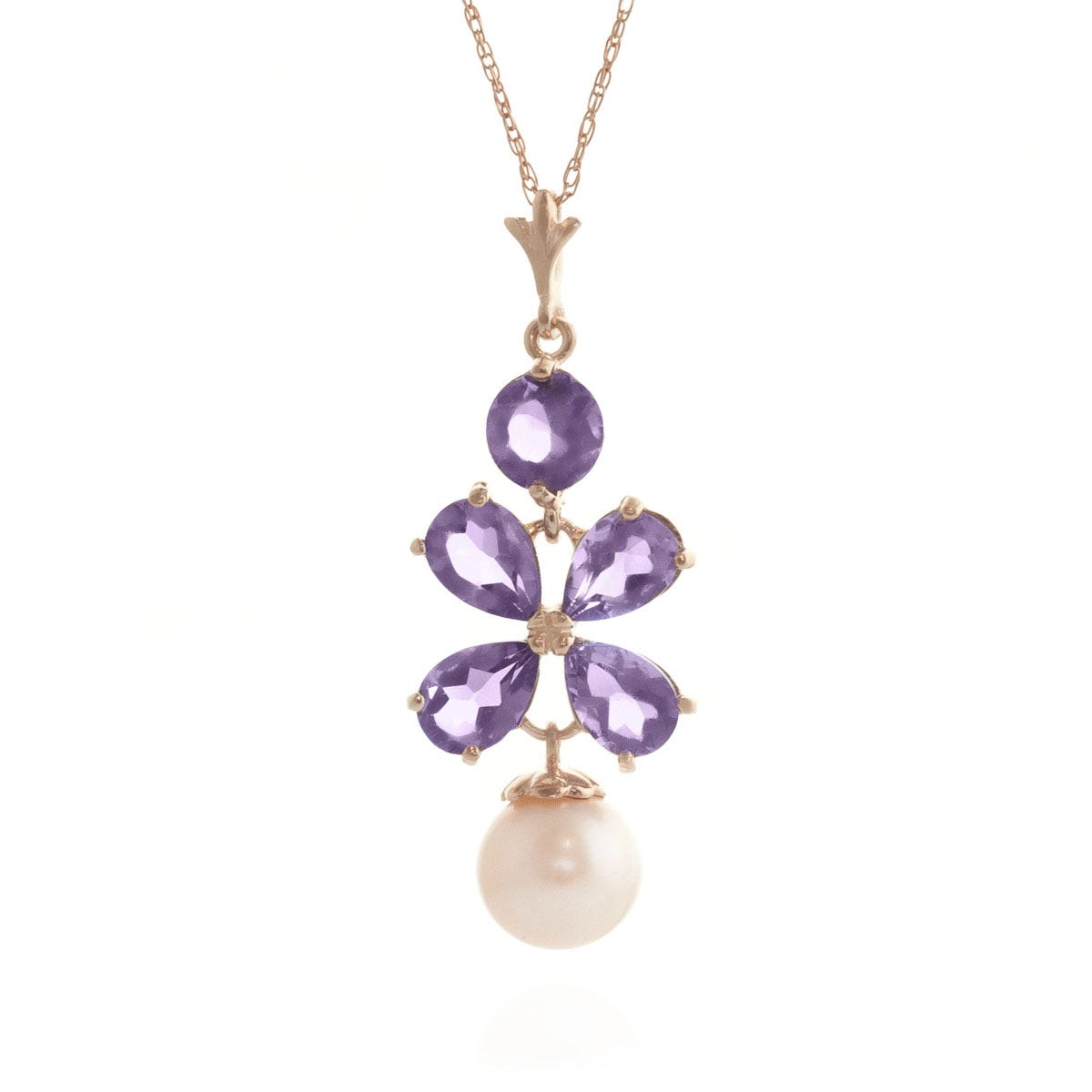 Amethyst & Pearl Pendant Necklace handcrafted in rose gold plated 9ct gold. Six gemstones, total 3.65 ct. Pear cut. The pendant is suspended from a rose gold double link rope chain with spring clasp. Size: 11.9 x 32.3 mm (0.47 x 1.27 in). Material: 9ct Rose Gold. Total metal weight: 2.54 gr. 4 pear cut amethysts (6 x 4 mm) = 2.15 ct total. 1 freshwater pearl (7 x 7 mm) = 1 ct. 1 round cut amethyst (5 x 5 mm) = 0.5 ct. Colour: Purple. Stone cut: Pear Cut. Anniversary: 6th Anniversary. Birthstone: February.
