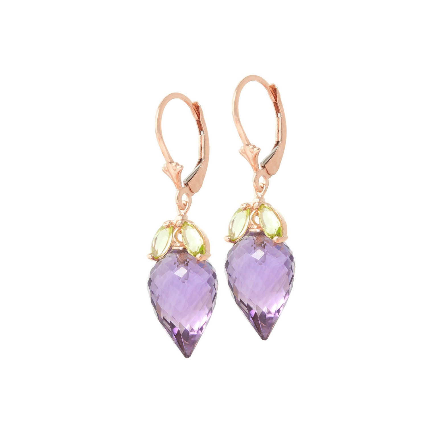 Amethyst & Peridot Chandelierdrop Earrings handcrafted in rose gold plated 9ct gold. Six gemstones, total 20 ct for both earrings combined. Pointed briolette cut. Size: 11.2 x 36.8 mm (0.44 x 1.45 in). Material: 9ct Rose Gold. Total metal weight: 4.8 gr. 2 pointed briolette cut amethysts (14 x 9 mm) = 19 ct total for pair. 4 marquise cut peridots (6 x 3 mm) = 1 ct total for pair. Colour: Purple. Stone cut: Pointed Briolette Cut. Anniversary: 6th Anniversary. Birthstone: February.