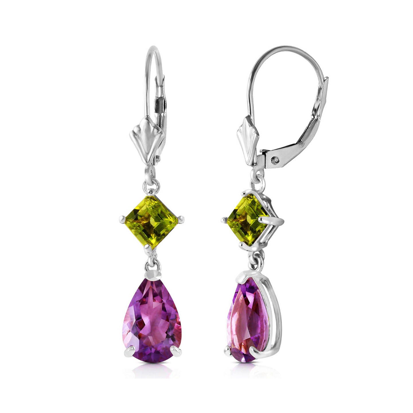 Amethyst & Peridot Leverback Earrings handcrafted in solid white gold. Four gemstones, total 4.5 ct for both earrings combined. Pear cut. Size: 6.1 x 34.5 mm (0.24 x 1.36 in). Material: 9ct White Gold. Total metal weight: 2.1 gr. 2 pear cut amethysts (9 x 6 mm) = 3.5 ct total for pair. 2 square cut peridots (4 x 4 mm) = 1 ct total for pair. Colour: Purple. Stone cut: Pear Cut. Anniversary: 6th Anniversary. Birthstone: February.