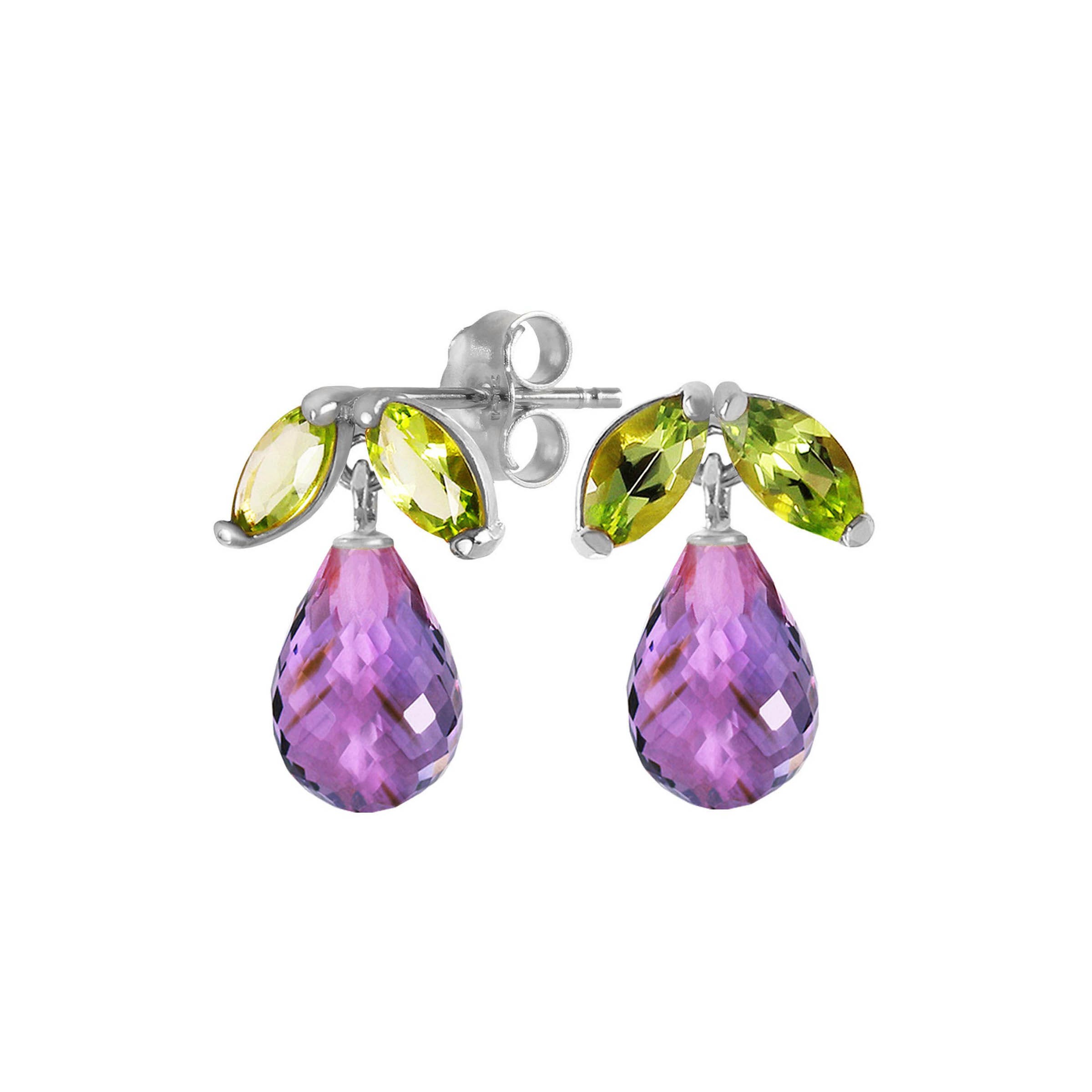 Amethyst & Peridot Stud Earrings handcrafted in solid white gold. Six gemstones, total 3.4 ct for both earrings combined. Briolette cut. Post with friction back to fasten. Size: 7.6 x 11.4 mm (0.3 x 0.45 in). Material: 9ct White Gold. Total metal weight: 1.0 gr. 2 briolette cut amethysts (7 x 5 mm) = 3 ct total for pair. 4 marquise cut peridots (4 x 2 mm) = 0.4 ct total for pair. Colour: Purple. Stone cut: Briolette Cut. Anniversary: 6th Anniversary. Birthstone: February.
