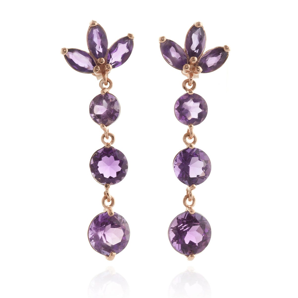 Amethyst Hoop Earrings handcrafted in rose gold plated 9ct gold. Twelve gemstones, total 8.7 ct for both earrings combined. Marquise cut. Size: 11.7 x 38.1 mm (0.46 x 1.5 in). Material: 9ct Rose Gold. Total metal weight: 3.1 gr. 6 marquise cut amethysts (6 x 3 mm) = 1.5 ct total for pair. 2 round cut amethysts (5 x 5 mm) = 1.2 ct total for pair. 2 round cut amethysts (6 x 6 mm) = 2.1 ct total for pair. 2 round cut amethysts (7 x 7 mm) = 3.9 ct total for pair. Colour: Purple. Stone cut: Marquise Cut. Anniversary: 6th Anniversary. Birthstone: February.