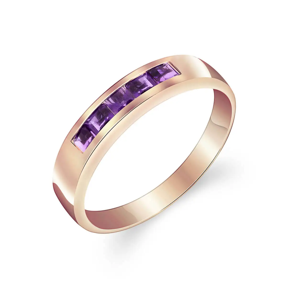 Amethyst Ring handcrafted in solid rose gold. Five genuine amethysts, total 0.6 ct. Princess cut. Available from sizes H to Z including half sizes. Size: 3.8 mm (0.15 in). Material: 9ct Rose Gold. Total metal weight: 2.1 gr. 5 princess cut amethysts (2.5 x 2.5 mm) = 0.6 ct total. Colour: Purple. Stone cut: Princess Cut. Anniversary: 6th Anniversary. Birthstone: February.