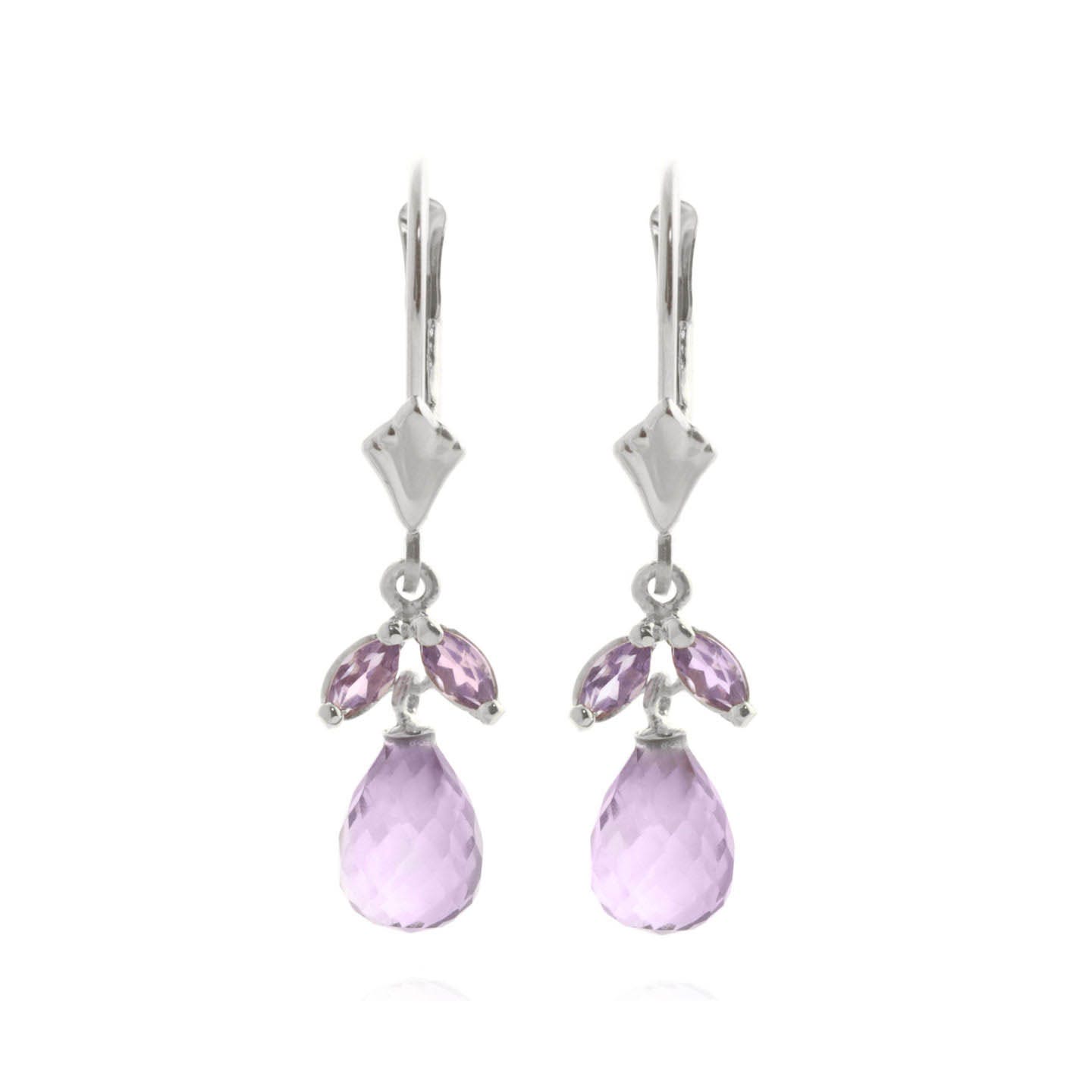 Amethyst Leverback Earrings handcrafted in solid white gold. Six gemstones, total 3.4 ct for both earrings combined. Briolette cut. Size: 7.6 x 27.9 mm (0.3 x 1.1 in). Material: 9ct White Gold. Total metal weight: 1.6 gr. 2 briolette cut amethysts (7 x 5 mm) = 3 ct total for pair. 4 marquise cut amethysts (4 x 2 mm) = 0.4 ct total for pair. Colour: Purple. Stone cut: Briolette Cut. Anniversary: 6th Anniversary. Birthstone: February.