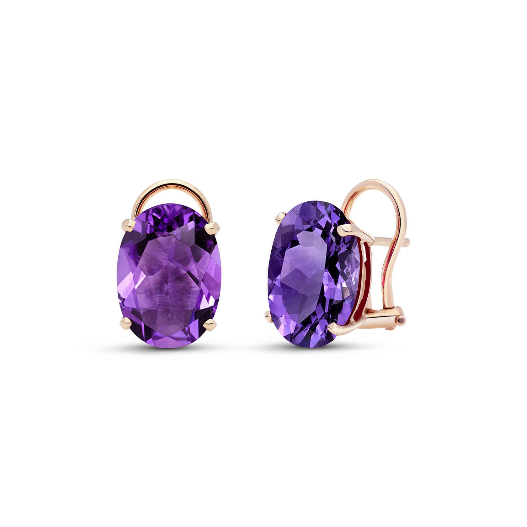 Amethyst Stud Earrings handcrafted in rose gold plated 9ct gold. Two genuine amethysts, total 15.1 ct for both earrings combined. Oval cut. Post with friction back to fasten. Size: 10.2 x 14 mm (0.4 x 0.55 in). Material: 9ct Rose Gold. Total metal weight: 4.3 gr. 2 oval cut amethysts (14 x 10 mm) = 15.1 ct total for pair. Colour: Purple. Stone cut: Oval Cut. Anniversary: 6th Anniversary. Birthstone: February.
