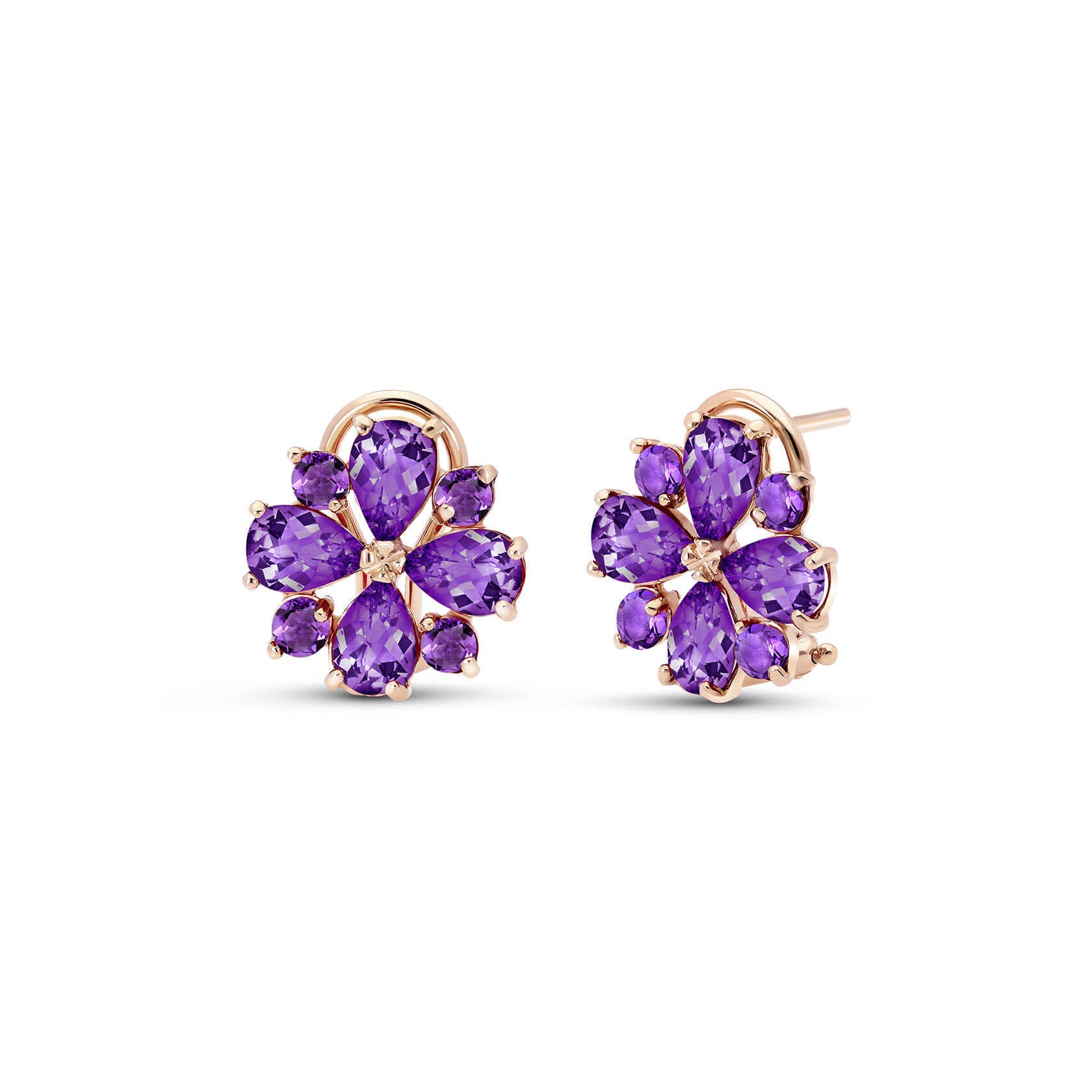 Amethyst Stud Earrings handcrafted in rose gold plated 9ct gold. 16 gemstones, total 4.85 ct for both earrings combined. Pear cut. Post with friction back to fasten. Size: 14 x 14 mm (0.55 x 0.55 in). Material: 9ct Rose Gold. Total metal weight: 3.1 gr. 8 pear cut amethysts (6 x 4 mm) = 3.25 ct total for pair. 8 round cut amethysts (3 x 3 mm) = 1.6 ct total for pair. Colour: Purple. Stone cut: Pear Cut. Anniversary: 6th Anniversary. Birthstone: February.