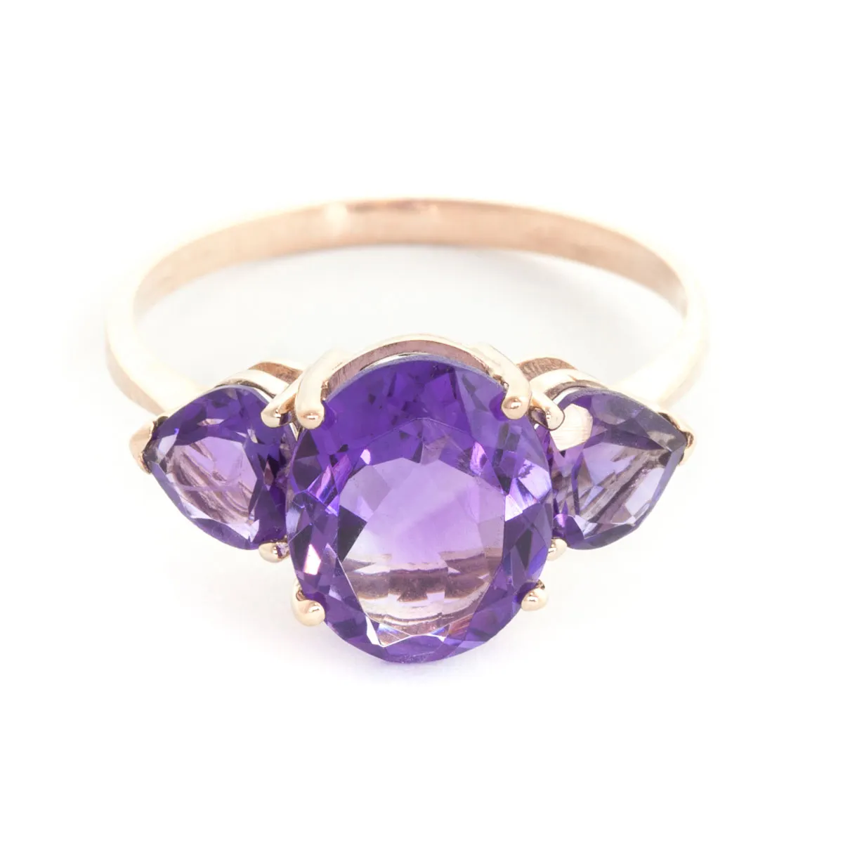 Amethyst Ring handcrafted in solid rose gold. Three gemstones, total 4 ct. Oval cut. Available from sizes H to Z including half sizes. Size: 9.9 mm (0.39 in). Material: 9ct Rose Gold. Total metal weight: 2.0 gr. 1 oval cut amethyst (10 x 8 mm) = 3 ct. 2 heart shaped amethysts (5 x 5 mm) = 1 ct total. Colour: Purple. Stone cut: Oval Cut. Anniversary: 6th Anniversary. Birthstone: February.