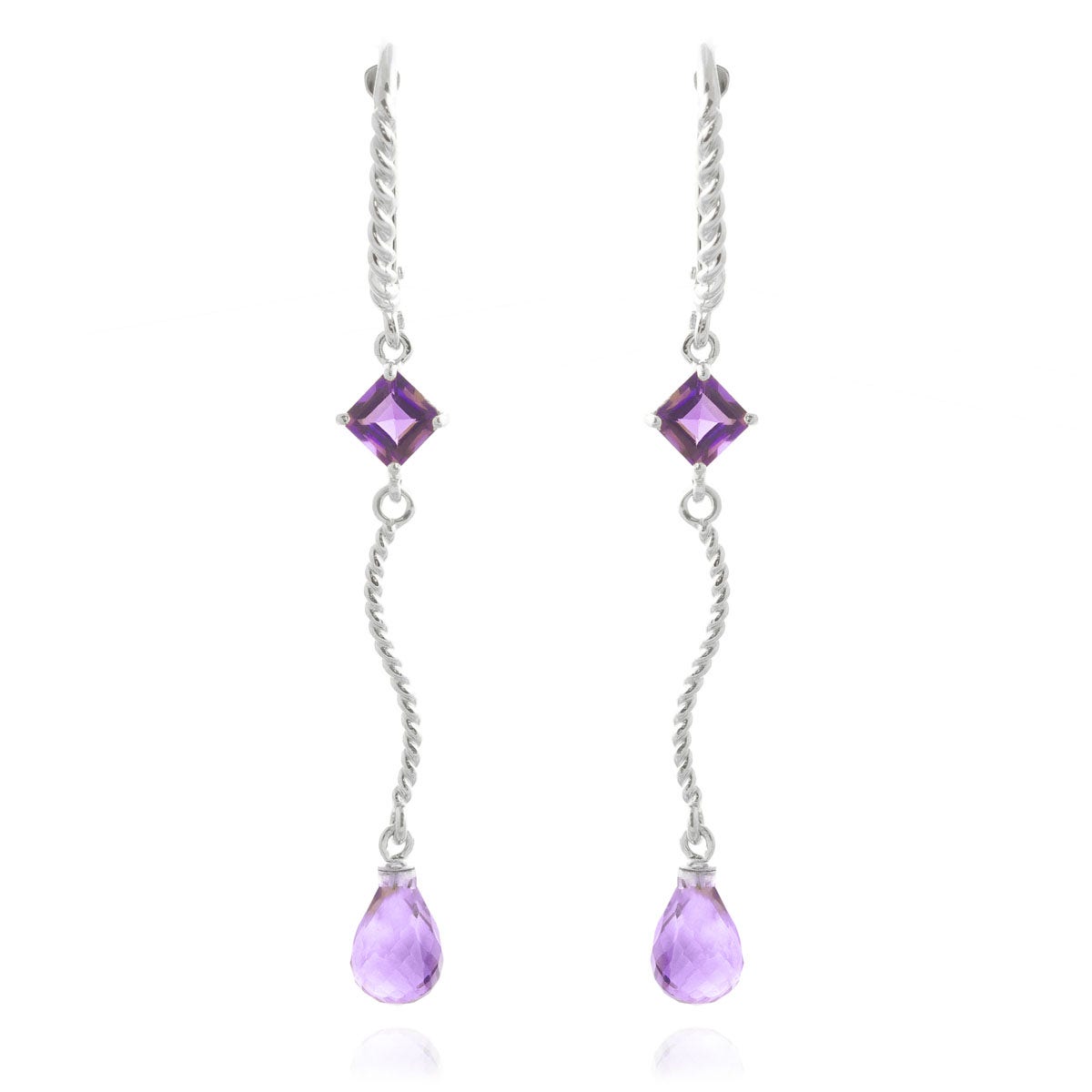 Amethyst Leverback Earrings handcrafted in solid white gold. Four gemstones, total 3.5 ct for both earrings combined. Square cut. Size: 5.3 x 55.4 mm (0.21 x 2.18 in). Material: 9ct White Gold. Total metal weight: 2.3 gr. 2 square cut amethysts (4 x 4 mm) = 1 ct total for pair. 2 briolette cut amethysts (9 x 6 mm) = 2.5 ct total for pair. Colour: Purple. Stone cut: Square Cut. Anniversary: 6th Anniversary. Birthstone: February.