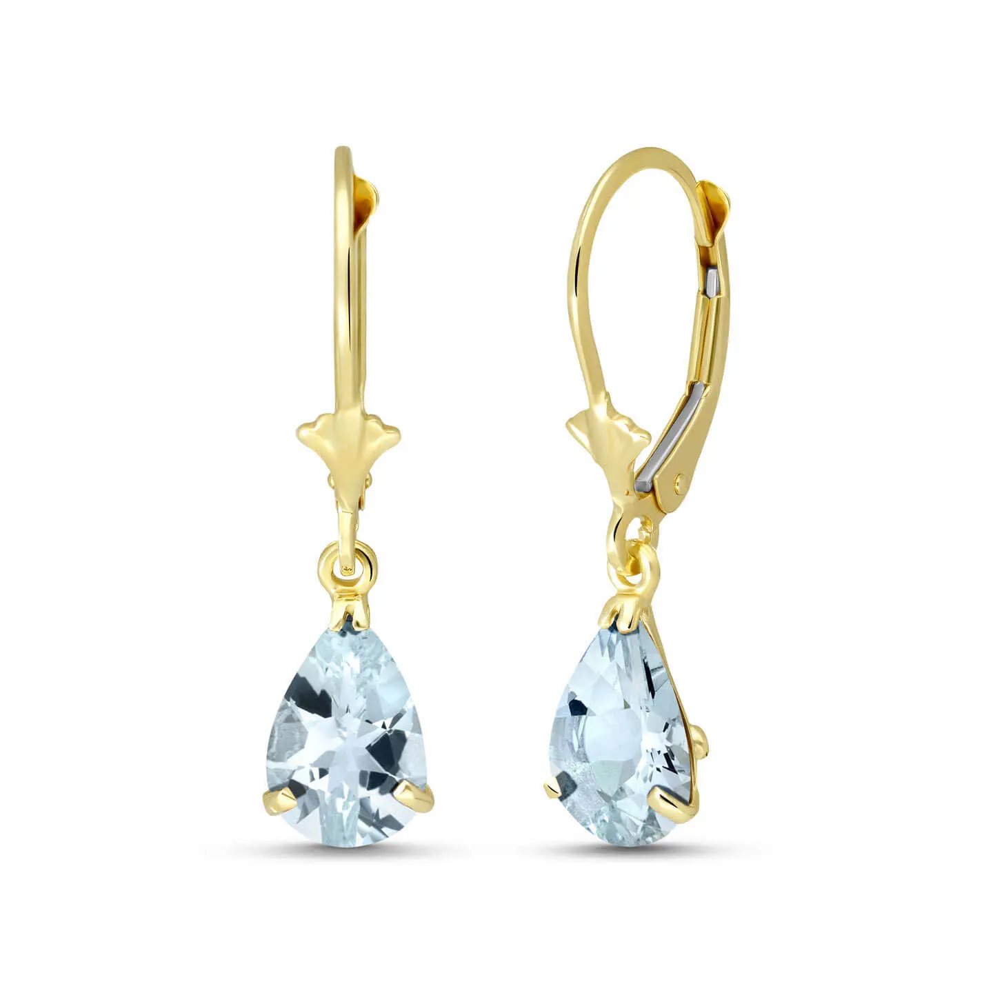 Aquamarine Leverback Earrings handcrafted in solid gold. Two genuine aquamarines, total 2.85 ct for both earrings combined. Pear cut. Size: 6.1 x 25.7 mm (0.24 x 1.01 in). Material: 9ct Gold. Total metal weight: 1.5 gr. 2 pear cut aquamarines (9 x 6 mm) = 2.85 ct total for pair. Colour: Blue. Stone cut: Pear Cut. Anniversary: 19th Anniversary. Birthstone: March.