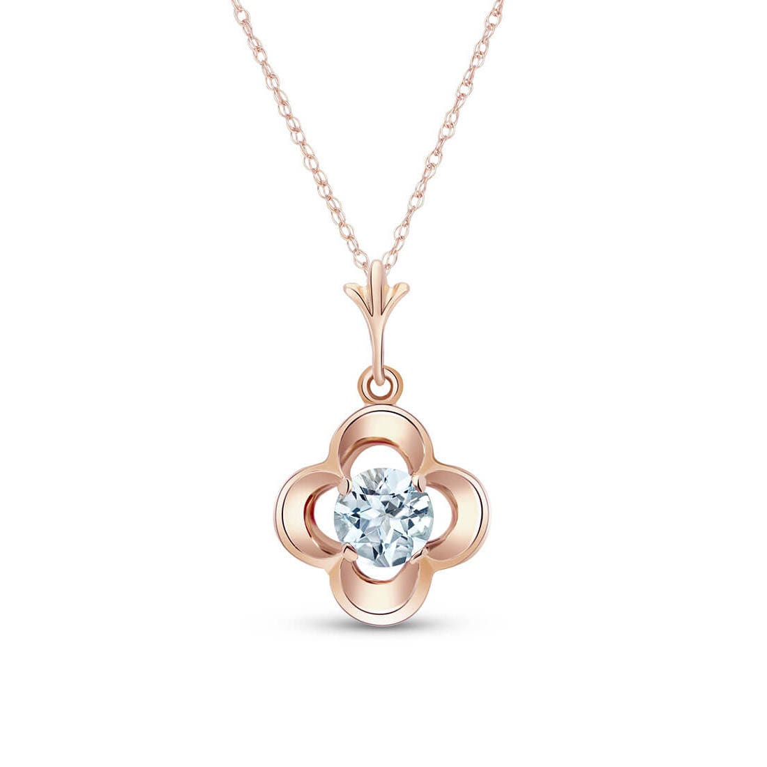 Aquamarine Pendant Necklace handcrafted in rose gold plated 9ct gold. Single 0.55 ct genuine aquamarine. Round cut. The pendant hangs from a rose gold double link rope chain with spring clasp. Size: 11.4 x 19.1 mm (0.45 x 0.75 in). Material: 9ct Rose Gold. Total metal weight: 1.54 gr. 1 round cut aquamarine (5 x 5 mm) = 0.55 ct. Colour: Blue. Stone cut: Round Cut. Anniversary: 19th Anniversary. Birthstone: March.
