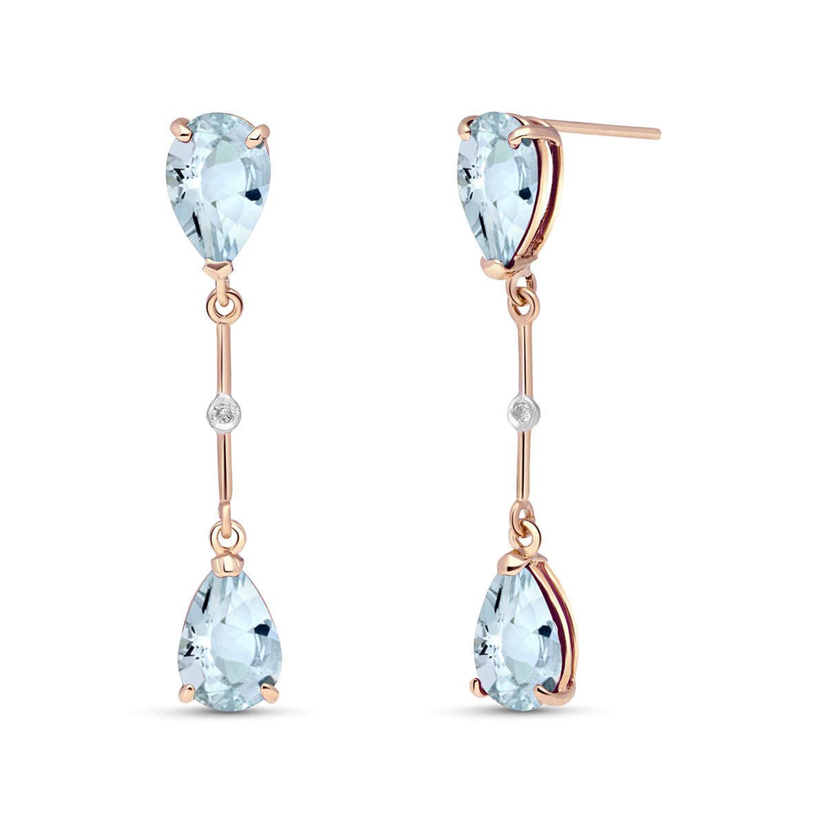 Aquamarine & Diamond Chandelierdrop Earrings handcrafted in rose gold plated 9ct gold. Four genuine aquamarines, total 6 ct, two diamonds, total 0.01 ct for both earrings combined. Pear cut. Size: 6.1 x 35.1 mm (0.24 x 1.38 in). Material: 9ct Rose Gold. Total metal weight: 2.6 gr. 4 pear cut aquamarines (9 x 6 mm) = 6 ct total for pair. 2 round cut diamonds (G colour, SI2 clarity) = 0.01 ct total for pair. Colour: Blue. Stone cut: Pear Cut. Anniversary: 19th Anniversary. Birthstone: March.