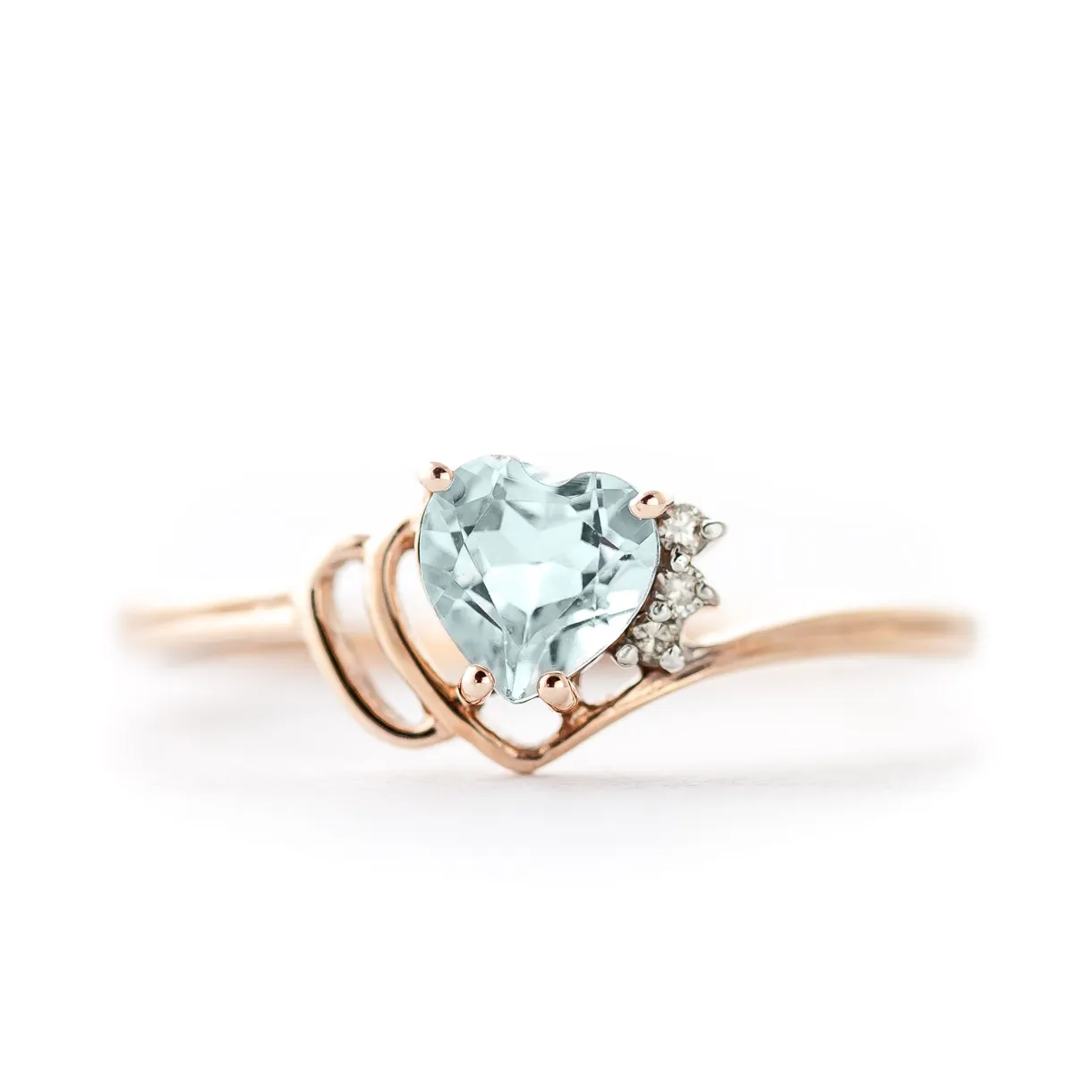 Aquamarine & Diamond Ring handcrafted in solid 18ct rose gold. Single 0.95 ct genuine aquamarine, three diamonds, total 0.02 ct. Heart shaped. Available from sizes H to Z including half sizes. Size: 8.1 mm (0.32 in). Material: 18ct Rose Gold. Total metal weight: 2.0 gr. 1 heart shaped aquamarine (6 x 6 mm) = 0.95 ct. 3 round cut diamonds (K colour, SI2 clarity) = 0.02 ct total. Colour: Blue. Stone cut: Heart Shaped. Anniversary: 19th Anniversary. Birthstone: March.