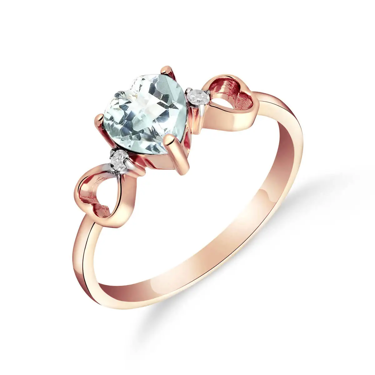 Aquamarine & Diamond Ring handcrafted in solid rose gold. Single 0.95 ct genuine aquamarine, two diamonds, total 0.01 ct. Heart shaped. Available from sizes H to Z including half sizes. Size: 6.6 mm (0.26 in). Material: 9ct Rose Gold. Total metal weight: 1.9 gr. 1 heart shaped aquamarine (6 x 6 mm) = 0.95 ct. 2 round cut diamonds (K colour, SI1 clarity) = 0.01 ct total. Colour: Blue. Stone cut: Heart Shaped. Anniversary: 19th Anniversary. Birthstone: March.