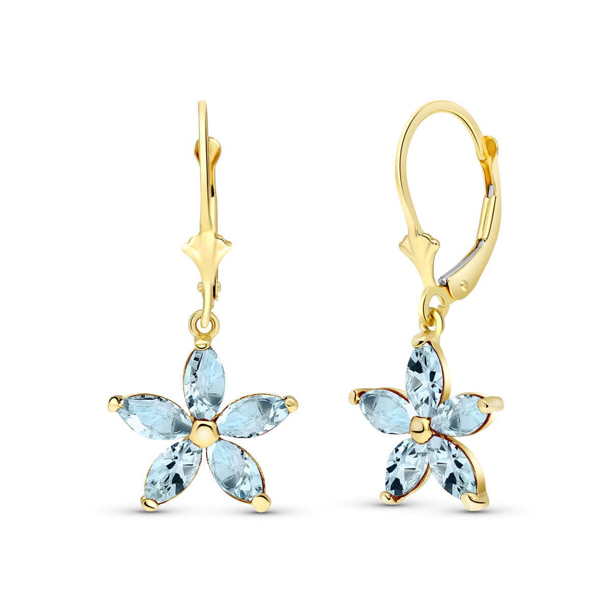 Aquamarine Leverback Earrings handcrafted in solid gold. Ten genuine aquamarines, total 2.8 ct for both earrings combined. Marquise cut. Size: 13 x 30 mm (0.51 x 1.18 in). Material: 9ct Gold. Total metal weight: 2.2 gr. 10 marquise cut aquamarines (6 x 3 mm) = 2.8 ct total for pair. Colour: Blue. Stone cut: Marquise Cut. Anniversary: 19th Anniversary. Birthstone: March.