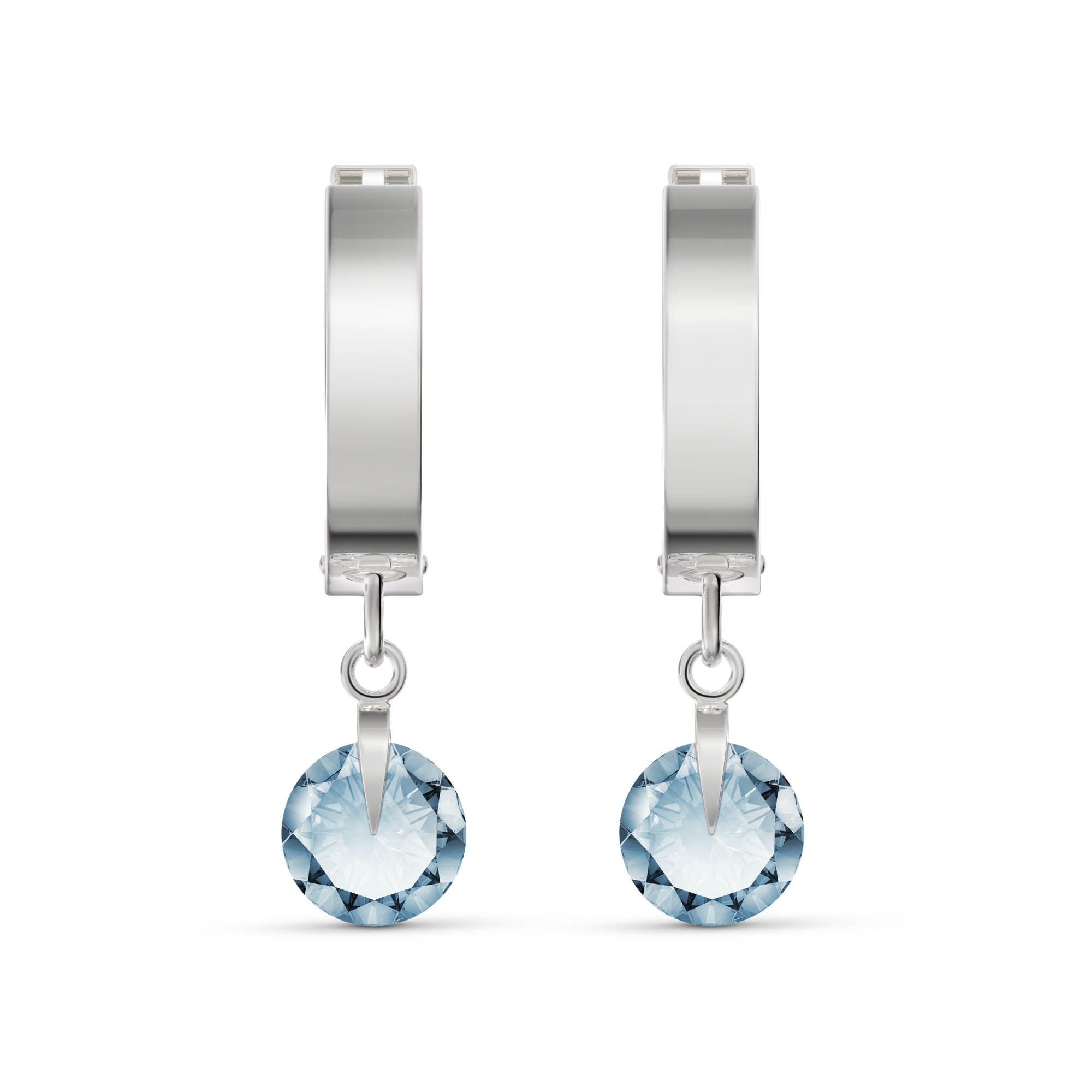 Aquamarine Hoop Earrings handcrafted in solid white gold. Two genuine aquamarines, total 1.3 ct for both earrings combined. Round cut. Size: 6.1 x 22.9 mm (0.24 x 0.9 in). Material: 9ct White Gold. Total metal weight: 1.4 gr. 2 round cut aquamarines (6 x 6 mm) = 1.3 ct total for pair. Colour: Blue. Stone cut: Round Cut. Anniversary: 19th Anniversary. Birthstone: March.