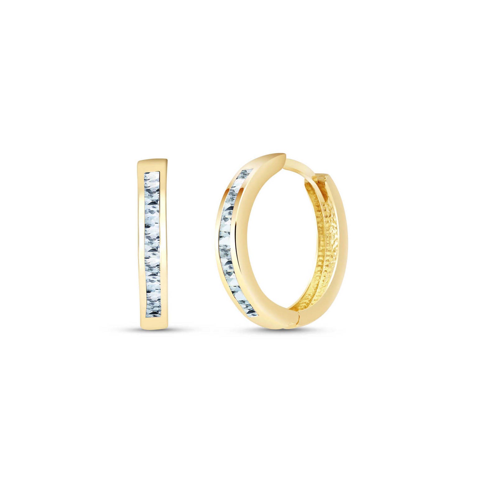 Aquamarine Hoop Huggie Earrings handcrafted in solid gold. 14 genuine aquamarines, total 1.2 ct for both earrings combined. Princess cut. Size: 3.3 x 19.1 mm (0.13 x 0.75 in). Material: 9ct Gold. Total metal weight: 2.6 gr. 14 princess cut aquamarines (2.5 x 2.5 mm) = 1.2 ct total for pair. Colour: Blue. Stone cut: Princess Cut. Anniversary: 19th Anniversary. Birthstone: March.