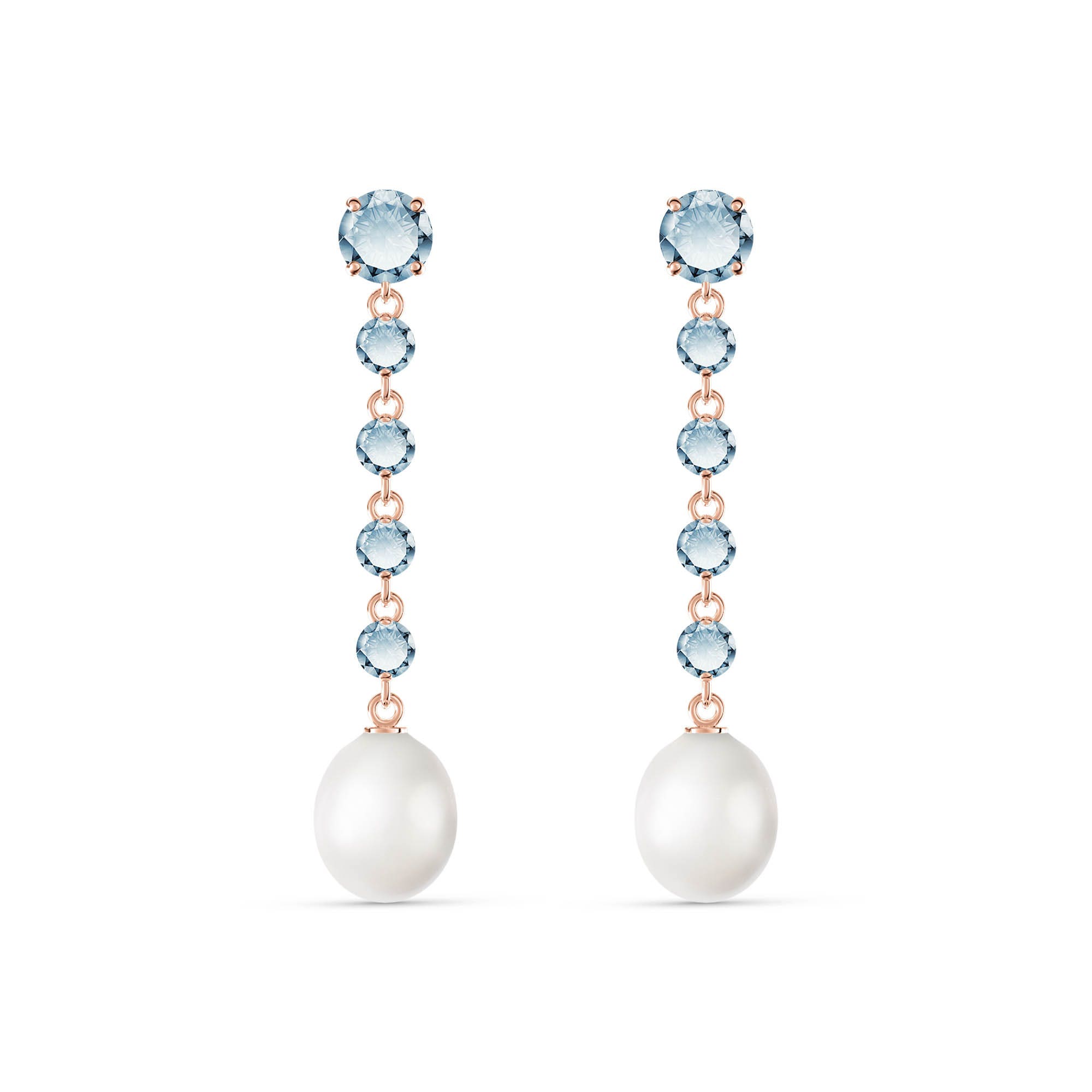 Aquamarine & Pearl Chandelierdrop Earrings handcrafted in rose gold plated 9ct gold. Twelve gemstones, total 10 ct for both earrings combined. Round cut. Size: 7.4 x 44.5 mm (0.29 x 1.75 in). Material: 9ct Rose Gold. Total metal weight: 3.4 gr. 2 round cut aquamarines (5 x 5 mm) = 1 ct total for pair. 8 round cut aquamarines (3 x 3 mm) = 1 ct total for pair. 2 freshwater pearls (10 x 8 mm) = 8 ct total for pair. Colour: Blue. Stone cut: Round Cut. Anniversary: 19th Anniversary. Birthstone: March.