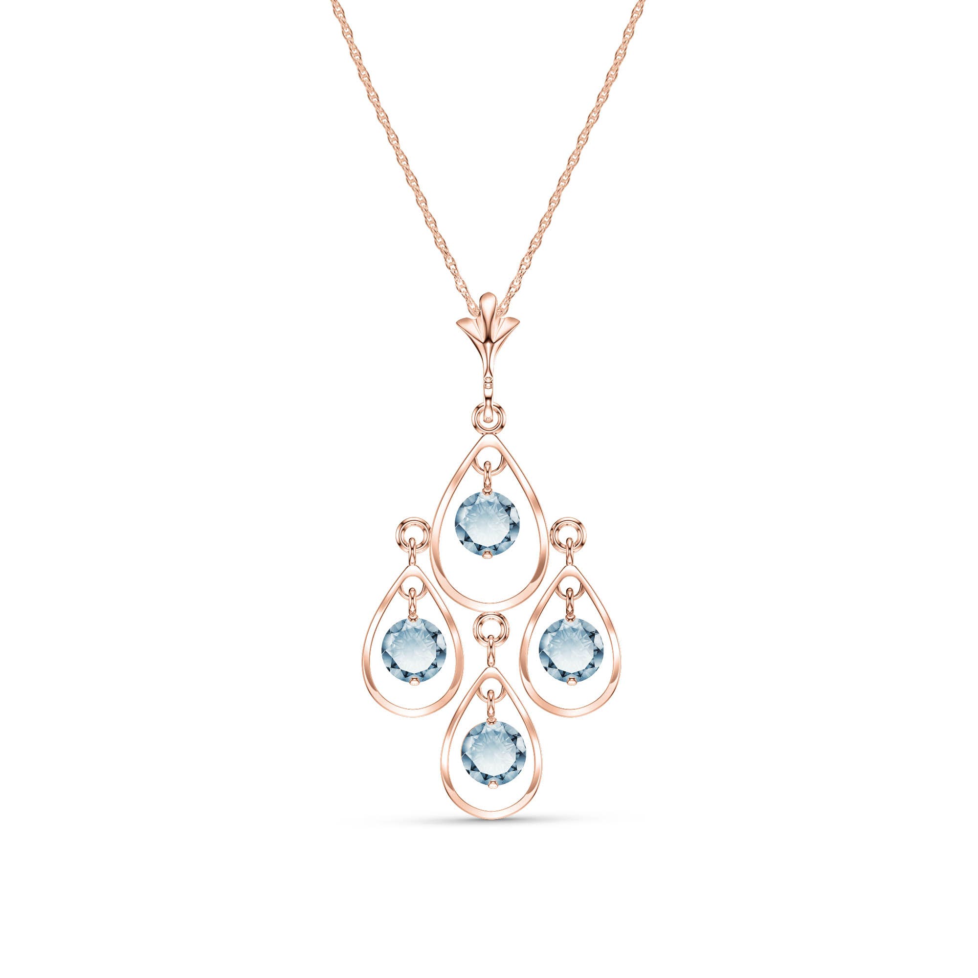 Pendant Necklace handcrafted in rose gold plated 9ct gold. Four genuine aquamarines, total 1.2 ct. Round cut. The pendant hangs from a rose gold double link rope chain with spring clasp. Size: 18 x 33 mm (0.71 x 1.3 in). Material: 9ct Rose Gold. Total metal weight: 2.04 gr. 4 round cut aquamarines (4 x 4 mm) = 1.2 ct total. Colour: Blue. Stone cut: Round Cut. Anniversary: 19th Anniversary. Birthstone: March.